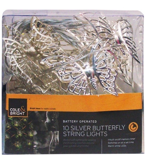Aspect : Coloris : ArgentDimensions : Diamètre (en cm) : 6,20Hauteur (en cm) : 8,00Longueur (en cm) : 140,00Profondeur (en cm) : 10,00Autres caractéristiques : Accessoires inclus : Piles AAInformations complémentaires : Programmable 6 et 12 heures d'allumage , Eclairage blanc chaudPoids (en kg) : 0,17 Guirlande LED intérieur extérieur papillon