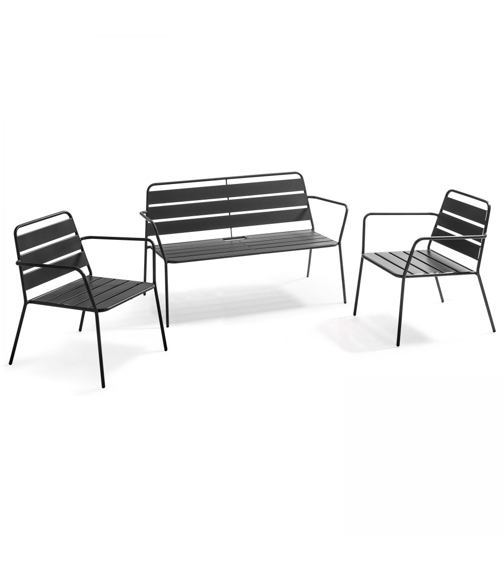 Cet ensemble PALAVAS de 4 places est composé d'un canapé de jardin 2 places en acier thermolaqué et de 2 fauteuils de jardin empilables. Aucun montage est nécessaire pour le canapé et les fauteuils, les produits sont livrés montés. Caractéristiques : Structure en acier Peinture époxy - Traité anti corrosion Dimensions du canapé : Longueur : 130 cm Largeur : 70 cmHauteur : 76 cm Dimensions du fauteuil : Longueur : 64,5 cm largeur : 70 cmHauteur : 76 cm Colis : Canapé : 33 kg Fauteuil : 6 kgPoids total : 45 kgAfin de prolonger sa durée de vie, hivernez si possible votre mobilier en acier en intérieur (une cave, un garage, un abri de jardin...). Idéalement dans un endroit sec et ventilé.