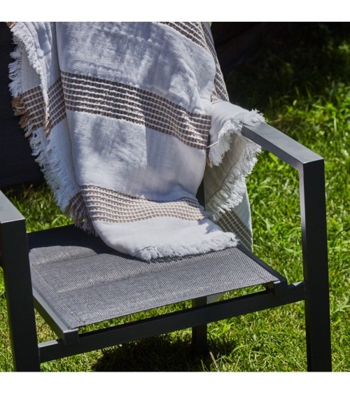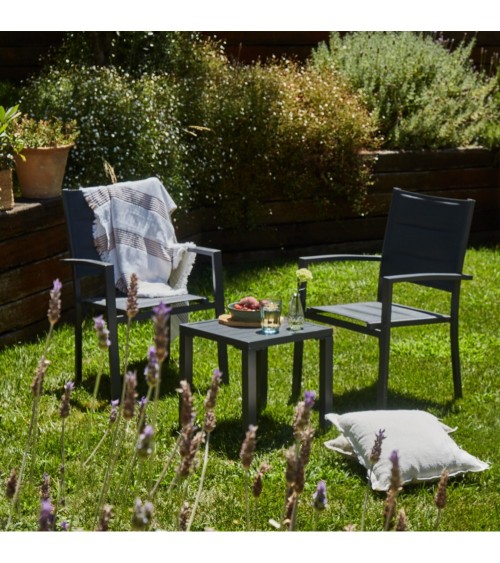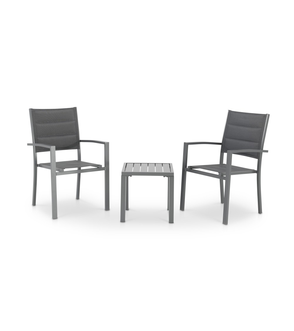 L'ensemble est composé de 2 chaises empilables ( H90 x L60 x PR57 ) en aluminium gris anthracite et tapissées de textilène couleur gris anthracite et d'une table basse ( H43x L45 x PR45 ) en aluminium couleur anthracite. Vous pouvez le combiner avec d'autres éléments de la famille Tokyo.