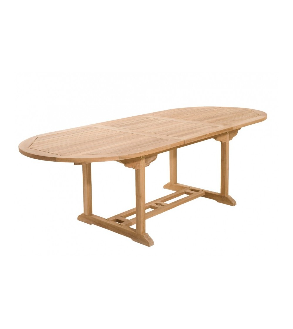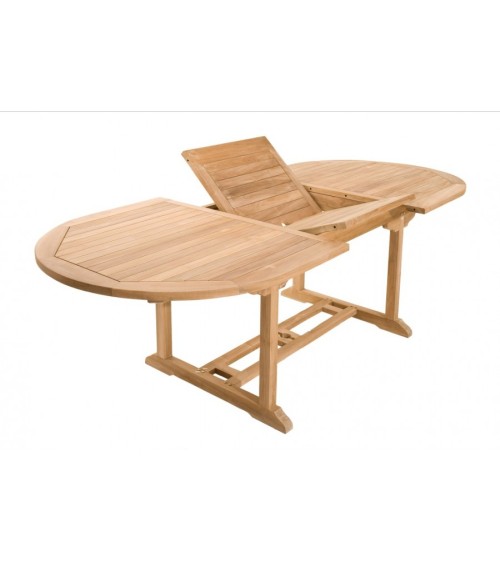 Table ovale extensible en bois. Dimensions : 180/240 x 100 x 75 cm. Article en teck brut. Cette table en teck comporte une allonge de 60 cm au centre du plateau. En un instant, vous tirez les deux côtés de la table afin de récupérer une extension qui se déplie très facilement. Un trou de parasol est présent au centre de la table - bien pratique pour maintenir le parasol quand le soleil se montre un peu trop imposant. La convivialité sera au rendez-vous avec cette table aux matières nobles. Le teck est un bois précieux et imputrescible très utilisé pour la fabrication de meubles de jardin car il est extrêmement résistant aux agressions climatiques les plus rudes et constantes (humidité). Nos meubles de jardin sont en teck massif de première qualité, ce qui exclut principalement les défauts et offre une finition qualitative. Les plantations Le bois utilisé dans la fabrication de nos meubles de jardin provient uniquement de forêts de replantation provenant de l'île de Java. Ces forêts sont gérées par l'organisme d'état Perum Perhutani, qui détermine une saisonnalité et un quota de coupe afin d'assurer la durabilité de la ressource. L'entretien Les meubles en teck peuvent rester à l'extérieur sans aucun traitement particulier. Après quelques mois voire quelques années, le bois prendra une teinte grisée. Pour conserver la couleur initiale de votre meuble ou pour retirer une tache, poncez légèrement ce dernier avec un papier de verre fin. Vous pouvez également appliquer une huile de teck en début de saison, il sera ainsi protégé et de couleur miel. Il est fortement conseillé d'abriter ce mobilier et de le protéger du gel pendant la période hivernale afin qu'il ne s'abîme pas.