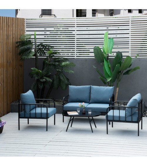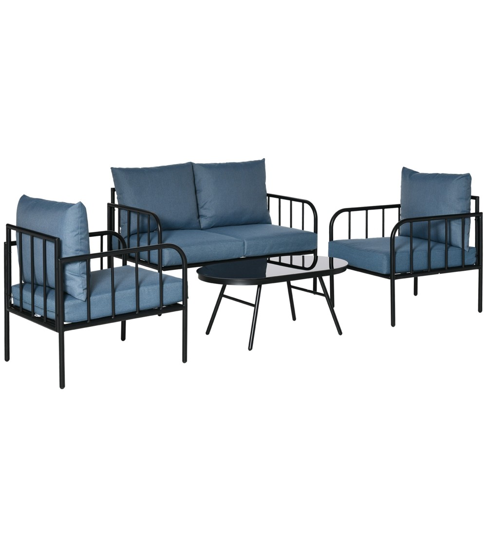 Ensemble salon de jardin 4 places métal époxy noir polyester bleu