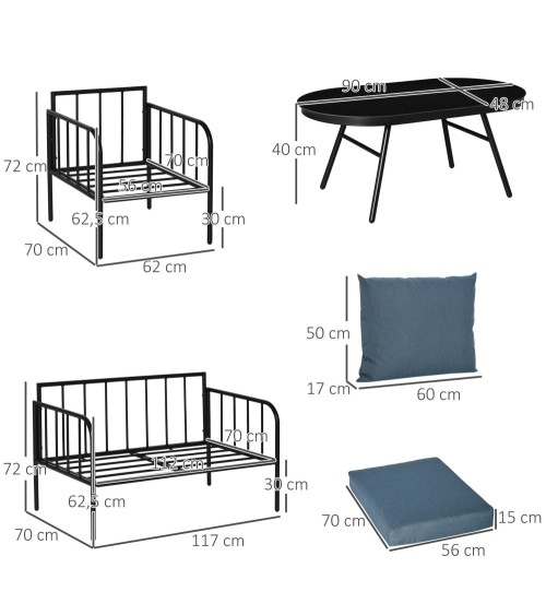 Ce splendide ensemble salon de jardin se composant d'une banquette 2 places, de 2 fauteuils et d'une table basse ovale avec structure tubulaire en métal noir époxy sublimera votre extérieur. L'originalité et élégance de ses lignes mélant arrondi et géométrie s'intégrera parfaitement à votre extérieur.Caractéristiques :- Salon de jardin design au style néo-rétro avec lignes mélant arrondi et géométrie qui s'intégrera parfaitement à votre extérieur- Ensemble salon de jardin 4 places 4 pièces composé de 2 fauteuils, d'un canapé 2 places et table basse ovale- Structure robuste en métal époxy anticorrosion coloris noir, coussins coloris bleu : jolie mixité de couleurs modernes- Coussins déperlants déhoussables avec zip : entretien pratique, facile- Grand confort : coussins avec épais garnissage mousse haute densité (15 cm d'épaisseur niveau assise, 17 cm niveau dossier) et revêtement polyester doux 230 g/m², assise profonde, dossier mi-hauteur, accoudoirs- Jolie table basse ovale avec plateau en verre trempé 5 mm- Montage facile à l'aide du manuel d'assemblage illustré fourniSpécifications :- Couleurs : bleu (coussins), noir (structure)- Matériaux principaux : métal époxy anticorrosion, garnissage mousse, polyester- Dim. canapé : 117L x 70l x 72H cm- Dim. fauteuils : 62L x 70l x 72H cm- Dim. table basse : 90L x 48l x 40H cm- Dim. assises : 112L x 70l cm (canapé 2 places), 56L x 70l cm (fauteuils)- Dim. coussins asssise : 56L x 70l cm (ép. : 15 cm)- Dim. coussins dossier : 60L x 50l cm (ép. : 17 cm)- Hauteur dossiers : 45 cm- Charge max. reco. : 220 Kg (canapé), 160 Kg (fauteuils), 30 Kg (table basse)- Livraison en un colis- Réf. : 84B-863