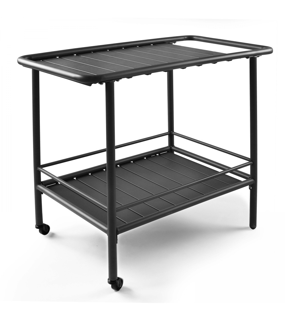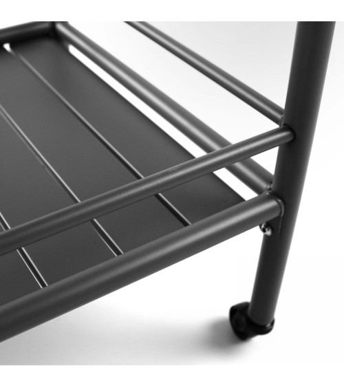 Profitez au maximum de vos repas en plein air avec la desserte de jardin à roulettes. Signée PALAVAS, elle présente un design indus et pratique, 100% acier thermolaqué. Avec ses 2 plateaux, elle permet de garder à portée de main rafraîchissements, salades et desserts sans encombrer votre table, et sa poignée large permet de la manipuler facilement ou d'y suspendre torchons et serviettes. Équipée de 2 roues à l'avant, elle se déplace sans efforts. La desserte de jardin en acier est traitée anti-corrosion à la peinture époxy et ne craint donc pas l'humidité. Facile à entretenir, il suffira d'un lavage rapide avec une éponge pour la maintenir en parfait état. Caractéristiques de la desserte de jardin Palavas : Desserte de jardinStructure 100% acierFinition anti-corrosion2 plateauxLarge poignée2 roues à l'avant Dimensions de la desserte de jardin Palavas : Longueur : 82 cm Profondeur : 45 cm Hauteur : 70 cm Colis :Poids du colis : 8,9 kgAfin de prolonger sa durée de vie, hivernez si possible votre mobilier en acier en intérieur (une cave, un garage, un abri de jardin...). Idéalement dans un endroit sec et ventilé.