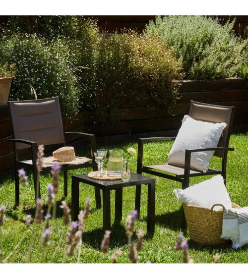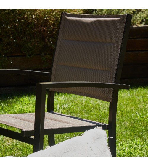 Lot de 8 chaises d'extérieur avec accoudoirs en aluminium marron et textilène rembourré couleur sable foncé. En plus d'être très confortables grâce à leurs accoudoirs et à leurs sièges et dossiers rembourrés, elles sont empilables, ce qui réduit considérablement l'espace de rangement. Ces chaises sont très légères car elles sont fabriquées en aluminium. Vous pouvez le combiner avec d'autres éléments de la famille Tokyo.