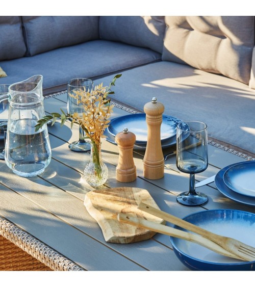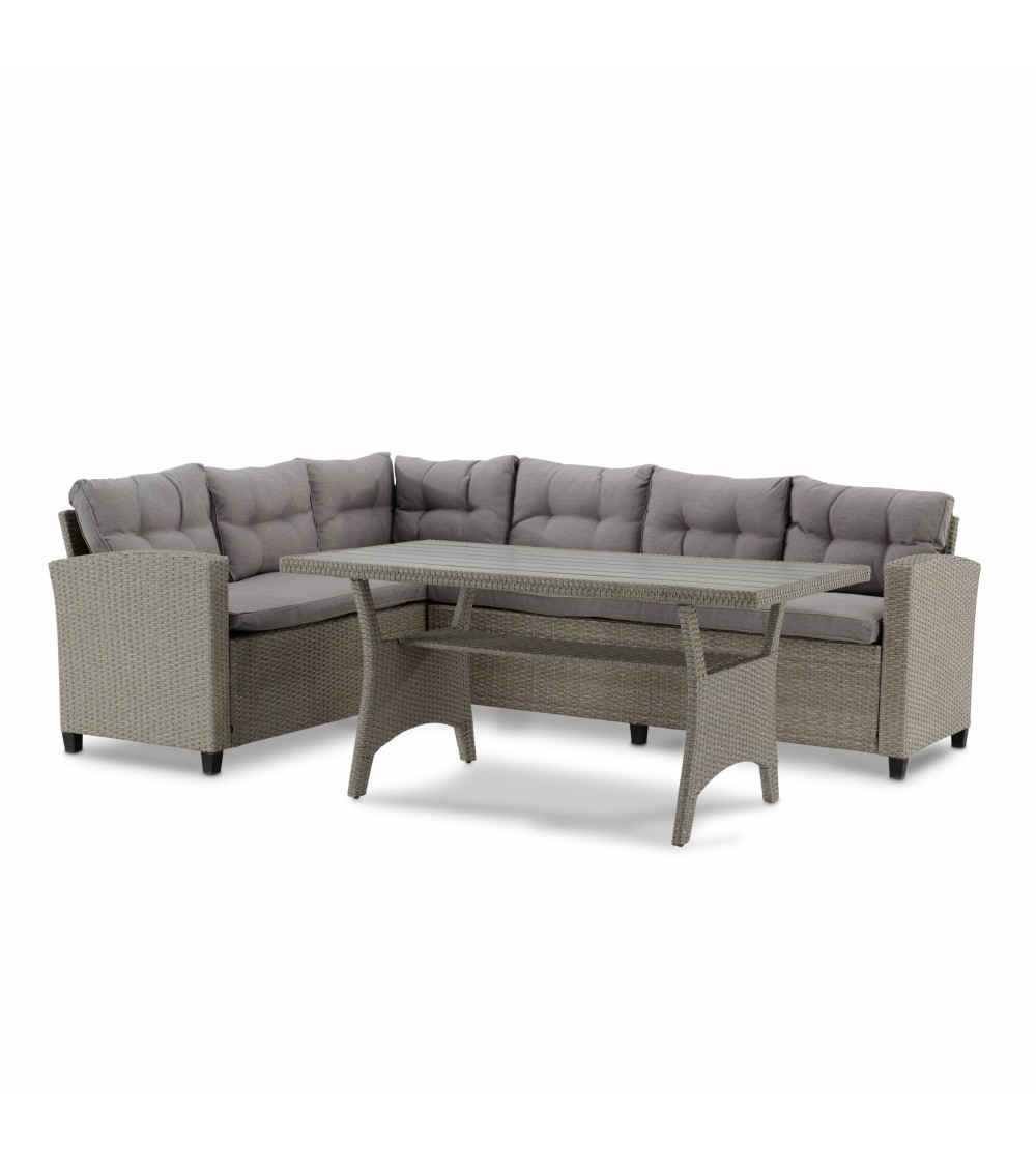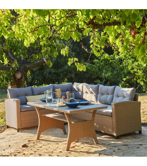 Salon de jardin ou terrasse comprenant une table haute ( H 68 x L 143 x PR 74 ) et deux canapés formant un coin ( Gauche H 73 x L 180 x PR 65 / Droite H 73 x L 239 x PR65 ), avec une structure en acier recouverte de rotin synthétique tressé à la main couleur beige. La table est dotée d'un plateau en lattes de polywood ce qui permet un nettoyage facile. Elle comprend également une étagère sous le plateau qui peut être utilisée pour stocker toutes sortes d'objets (magazines, bougies, etc.). Les meubles sont conçu pour profiter confortablement de vos repas en plein air grâce aux accoudoirs et coussins rembourrés couleur beige. Les housses sont amovibles permetant un lavage et un entretien faciles. C'est le complément idéal pour votre terrasse, votre porche ou votre jardin. Vous pouvez également combiner cet ensemble avec les différents éléments qui composent la famille Verona.