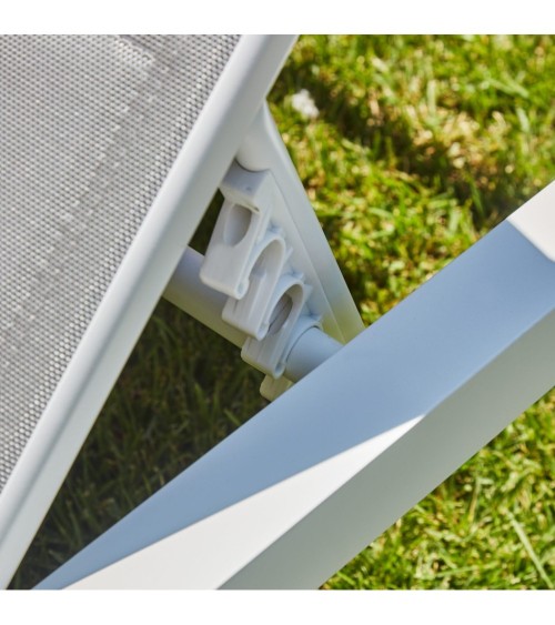Bain de soleil d'extérieur à roulettes pour jardin ou terrasse fabriqué avec une structure en aluminium blanc et rembourré en textilene dans le dossier et le siège en couleur gris. Vous pouvez régler le dossier jusqu'à 5 positions pour positionner la chaise longue comme vous le souhaitez. Cette chaise longue en aluminium avec roues vous permet de vous allonger à plat, ce qui est très important lorsque vous prenez le soleil sur le dos. Elle comprend 2 roues pour déplacer facilement le bain de soleil.