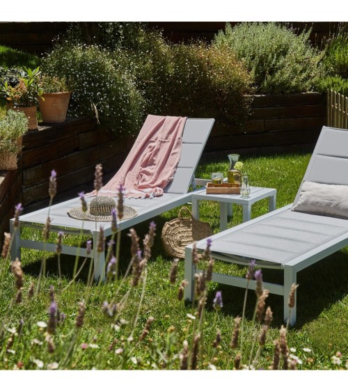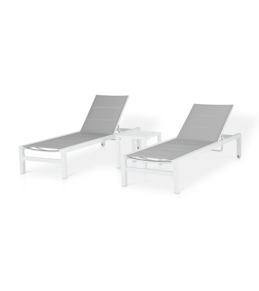 L'ensemble est composé de 2 chaises longues droites en aluminium et textilène rembourré avec roulettes et dossier inclinable de couleur blanc + 1 table d'appoint ( H43x L45 x PR45 ) en aluminium de couleur blanc.