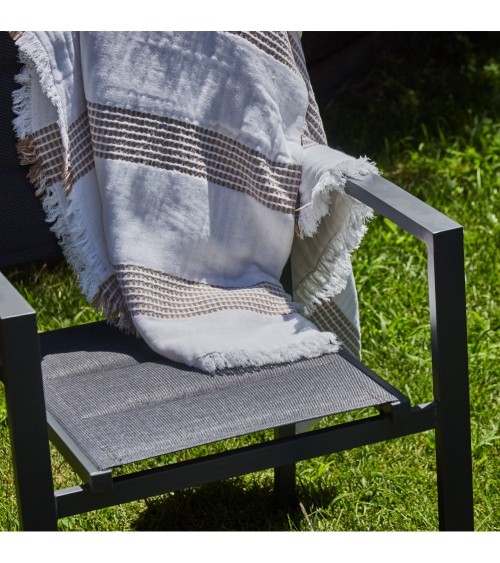 Lot de 8 chaises d'extérieur avec accoudoirs en aluminium et textilène rembourré couleur gris anthracite. En plus d'être très confortables grâce à leurs accoudoirs et à leurs sièges et dossiers rembourrés, elles sont empilables, ce qui réduit considérablement l'espace de rangement. Ces chaises sont très légères car elles sont fabriquées en aluminium. Vous pouvez le combiner avec d'autres éléments de la famille Tokyo.