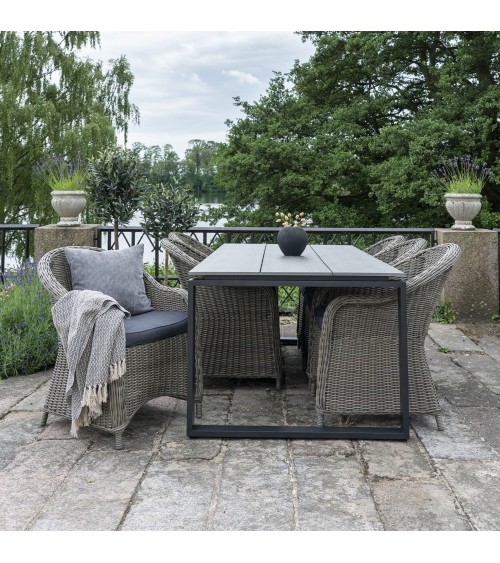Pour profiter de moments privilégiés entre amis ou en famille sur votre terrasse, découvrez vite la table de jardin bi-matière Denver signée House Nordic. Cette grande table d'extérieur facile d'entretien de taille 220 x 100 cm se dote d'un plateau en plastique gris foncé et de pieds larges en aluminium noir. Reliés 2 par 2 au niveau de la base, ils offrent un rendu très géométrique. La table Denver peut accueillir aisément 6 personnes. Même en installant des fauteuils confortables et enveloppants, chacun sera bien à l'aise car les dimensions de la table le permettent. Cette table de jardin de style contemporain et aux lignes épurées pourra se marier aisément à des chaises modernes, mais vous pouvez aussi la combiner à des fauteuils en rotin, idéaux en extérieur, ou à des sièges au look vintage pour mixer les styles. Grâce à son duo de couleurs sobres, cette table pourra s'accompagner de chaises de la couleur de votre choix, sans problème. Pour compenser le côté minimaliste de ce modèle, n'hésitez pas à installer des chaises de jardin dépareillées, pour un résultat très éclectique. Cette grande table est assurément un appel à la convivialité ! Elle sera parfaite pour déjeuner, dîner, et refaire le monde pendant des heures.