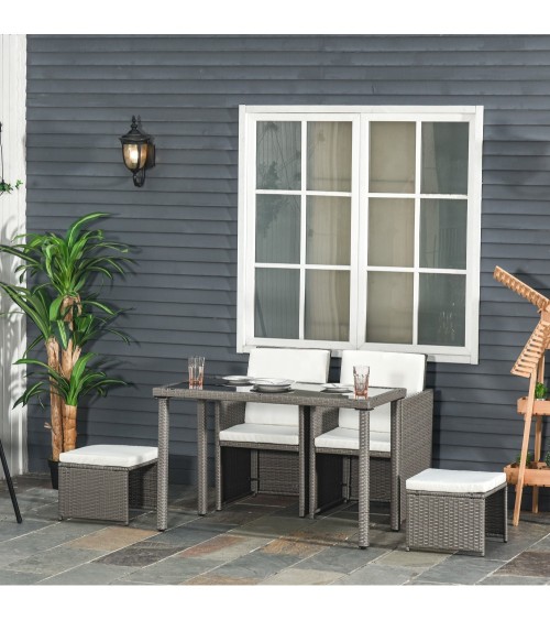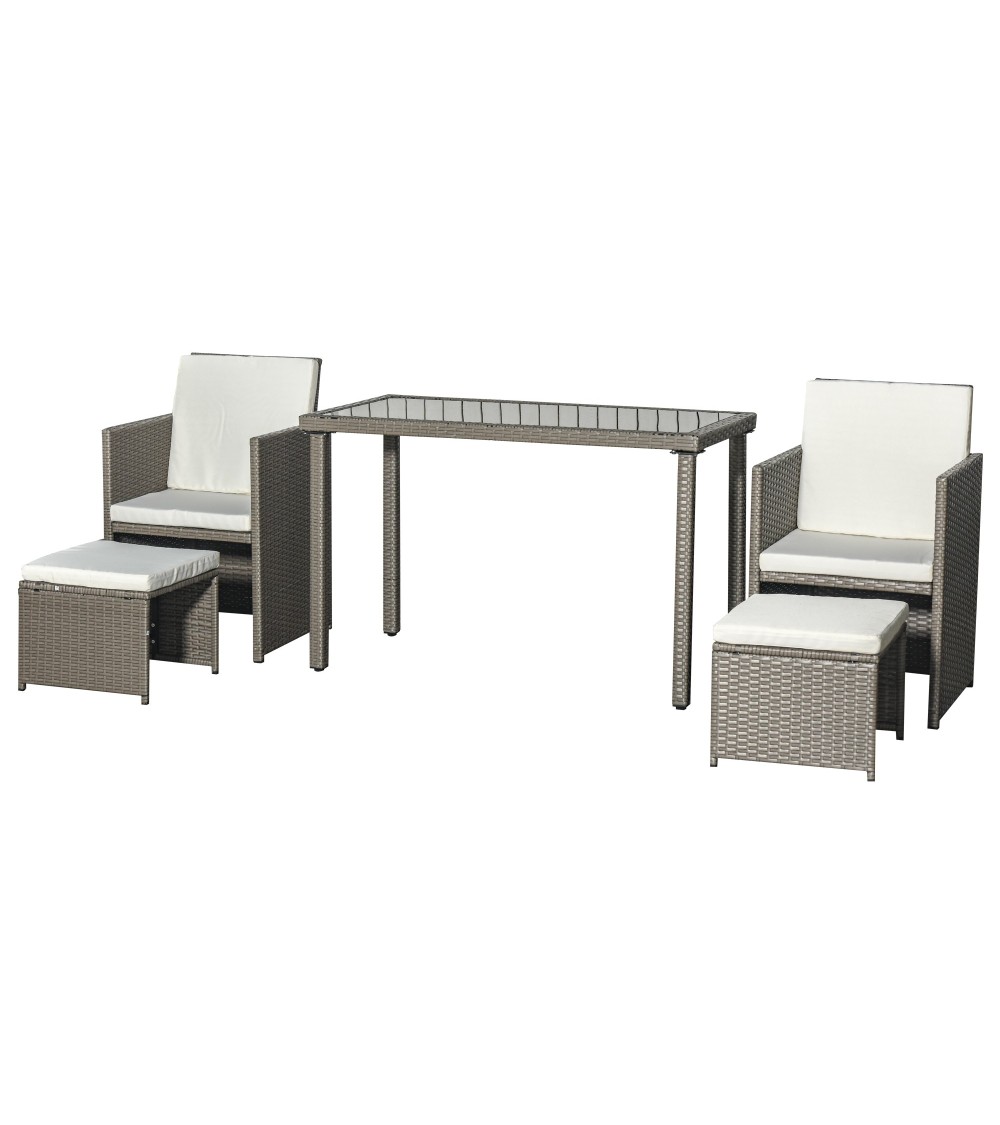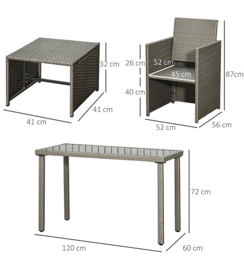 Ce magnifique salon de jardin encastrable pour 4 personnes composé d'une table avec plateau verre trempé, de 2 fauteuils, de 2 poufs et de 6 coussins déhoussables sera idéal pour aménager votre balcon, terrasse ou jardin. Mêlant avec élégance les matériaux, résine tressée et verre trempé, sans oublier sa capacité de rangement ultra compact en cas d'inutilisation, cet ensemble de jardin très confortable vous apportera pleine satisfaction.Caractéristiques : - Ensemble salon de jardin 4 personnes composé d'une table rectangulaire avec plateau en verre trempé, de 2 fauteuil et de 2 poufs grand confort- Grande polyvalence, utilisation intérieure extérieure possible : jardin, balcon, patio, véranda, etc.- Revêtement en PE résine tressée imitation rotin pour une plus grande résistance au soleil, à la pluie, au froid, etc.- 6 coussins imperméabilisés déhoussables (rembourrage 5 cm) fournis afin de vous en faciliter leur entretien- Plateau de table haut de gamme en verre trempé 5 mm- Fauteuils et tabourets monoblocs encastrables sous la table : optimisation de votre espace libre disponible en cas d'inutilisation- Châssis tubulaire en métal époxy robuste pour une durée de vie pérenne- Assemblage facile et rapide à l'aide d'une notice de montage illustrée Spécifications : - Couleurs principales : gris et crème- Matériaux principaux : métal époxy anticorrosion, PE résine tressée imitation rotin, polyester, mousse de rembourrage, verre trempé- Dim. table : 120L x 60l x 72H cm- Dim. fauteuils : 56L x 52l x 87H cm- Dim. repose-pieds : 41L x 41l x 31H cm- Accessoires fournis : 6 coussins- Charge max. recommandée : 150 Kg (fauteuils), 70 Kg (table), 100 Kg (poufs)- Réf. : 863-009GY