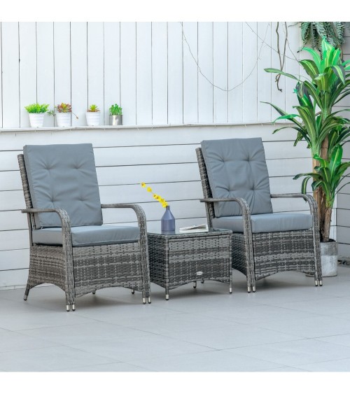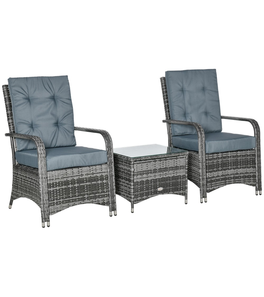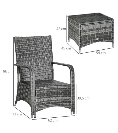 Ce superbe lot de 2 fauteuils de jardin grand confort (coussins déhoussables inclus) accompagné d'une jolie table basse coffre en résine tressée imitation rotin sublimera votre extérieur !Caractéristiques :- Ensemble de jardin 2 places 3 pièces composé d'un lot de 2 fauteuils grand confort et d'une jolie table basse assortie avec plateau verre trempé- Structure robuste en métal époxy anticorrosion et revêtement en résine tressée imitation rotin : matériaux de qualité résistant aux rayons UV, à l'humidité et ne nécessitant pas d'entretien particulier- Coussins d'assise déhoussables : usage pérenne, entretien pratique et facile- Garnissage mousse haute densité, revêtement polyester haute densité : confort optimum d'utilisation- Pieds équipés de patins antidérapants : stabilité optimale, aucun risque de rayure de votre sol- Idéal pour installation sur une terrasse, autour d'une piscine, sur un balcon, dans le jardin, etc.- Montage facile, rapide à l'aide du manuel d'assemblage illustré fourni- Recommandation : veuillez utiliser la housse de protection incluse si inutilisation afin d'optimiser sa durée de vieSpécifications :- Couleur : gris- Matériaux principaux : métal époxy anticorrosion, résine PE, garnissage mousse, polyester- Dim. fauteuils : 62L x 73l x 95H cm- Dim. table basse : 54L x 45l x 42H cm- Dim. assises (sans coussins) : 50L x 46l x 39,5H cm- Dim. coussins d'assise et dossier : 56L x 49l cm (épaisseur : 9 cm)- Dim. housse de protection : 195L x 78l x 98H cm- Charge max. recommandée : 160 Kg (fauteuils), 30 Kg (table basse)- Livraison effectuée en 2 colis- Réf. : 841-143V02GY