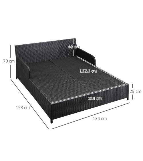 Ce magnifique lit canapé de jardin Outsunny sublimera votre intérieur (véranda) ou extérieur (terrasse, balcon, jardin) grâce à son style cosy très tendance. Son grand confort vous permettra d'en profiter un maximum en toute circonstance, en couple, en famille ou entre amis, de quoi épater tous vos convives !Caracteristiques :- Ce lit canapé de jardin est idéal pour vous détendre et profiter du soleil dans votre jardin ou sur le patio- Magnifique lit canapé de jardin grand confort qui sublimera votre terrasse, balcon, patio, véranda, jardin et épatera vos amis- Canapé pouvant accueillir 2 personnes (charge max. recommandée de 320 Kg)- Idéal pour l'intérieur ou l'extérieur- Matelas assise, 2 coussins de dossier + 2 coussins décoratifs pour ajouter une touche cosy- Housses polyester déperlant et déhoussable pour faciliter l'entretien- Structure en acier robuste recouvert de résine tressée : matériaux de qualité pour un usage prolongé en extérieur- Montage facile à l'aide du manuel d'assemblage illustré fourniSpécifications :- Couleurs principales : marron, beige- Matériaux principaux : acier, rotin PE, polyester- Dim. totales : 158l x 134P x 70H cm- Dim. assise : 134l x 152,5P cm- Dim. dossier : 134l x 41H cm- Dim. matelas assise : 134l x 151P cm (épaisseur : 8 cm)- Dim. coussins dossier : 62l x 35P cm (épaisseur : 20 cm)- Dim. petits coussins : 40l x 40P cm- Hauteur d'assise (sans coussin) : 30 cm- Largeur de l'accoudoir : 3 cm- Charge max. recaommandée : 320 kg- Réf : 862-060CW