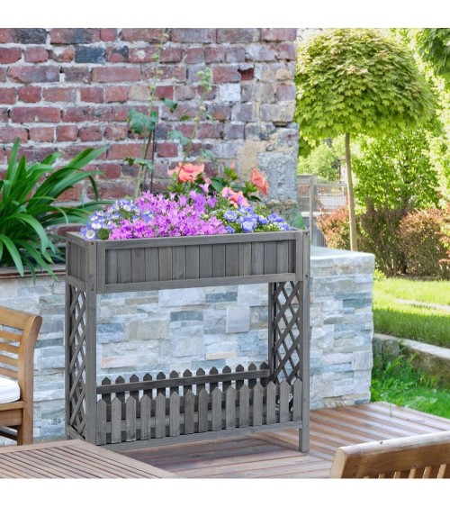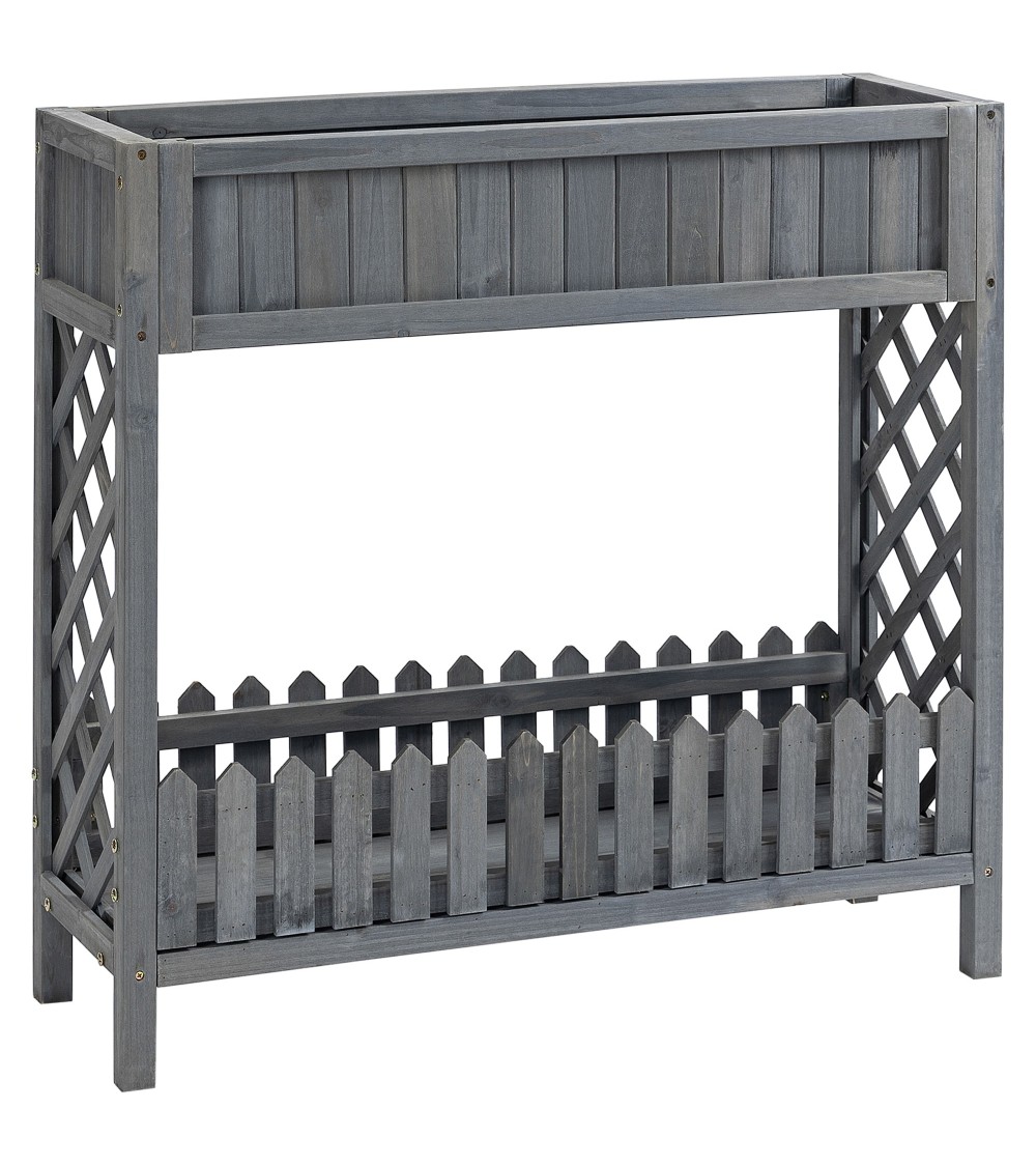 Cette magnifique jardinière sur pied en bois de sapin pré-huilé peint en gris vous permettra de faire vos plantations de légumes, plantes aromatiques ou fleurs sans avoir à vous baisser. Compacte, très élégante, dotée d'une étagère avec jolies barrières et de pans latéraux en treillis, elle s'intègrera parfaitement sur votre balcon, terrasse, patio ou jardin. Caractéristiques : - Jardinière carré potager sur pieds idéal pour jardiner à domicile sans avoir à se baisser- Jardinière en bois de sapin pré-huilé peint en gris idéale pour ajouter une touche d'originalité et d'élégance à votre extérieur- Carré potager grande taille permettant de faire pousser tous types de plantations (légumes, plantes aromatiques ou fleurs) sans ajout d'insecticide- Etagère inférieure vous offrant un espace supplémentaire pour mettre des pots de fleurs, placer quelques décorations ou accessoires de jardin- Belle finition : étagères avec jolies barrières, pans latéraux en treillis- Conçue et fabriquée avec un matériau résistant (bois de sapin pré-huilé et peint) pour un usage pérenne- Inserts d'irrigation inclus favorisant l'écoulement de l'eau et optimisant l'oxygénation de la terre et de vos plantes- Jardinière robuste : charge max. recommandée totale de 100 Kg- Montage simple et rapide à l'aide du manuel d'assemblage illustré fourni Spécifications : - Couleur : gris- Matériau : bois de sapin pré-huilé et peint- Dim. totales : 90L x 30l x 90H cm- Dim. bac jardinière : 83,5L x 24l x 17H cm- Dim. étagère : 85L x 24,5l x 10H cm- Ø inserts d'irrigation : 2 cm- Charge max. recommandée : 75 Kg (jardinière), 25 Kg (étagère)- Livraison effectuée en un colis- Réf : 845-712GY