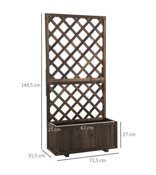 Sublimez votre extérieur avec cette jardinière sur pied et son treillis en bois de sapin traité par carbonisation.Caractéristiques : - Jardinière rectangulaire sur pieds avec treillis idéale pour planter et mettre en valeur vos jolies fleurs, plantes grimpantes ou autre- Corps en lattes de bois verticales qui ajoutera une touche d'élégance supplémentaire à votre extérieur- Treillis haut qui préservera votre intimité dans votre jardin ou balcon- Conçu et fabriqué en bois de sapin traité par carbonisation : usage pérenne sans entretien- Jardinière robuste : charge max. recommandée de 25 Kg- Inserts d'irrigation inclus pour favoriser le drainage de l'eau et assurer le bon développement de vos plantes- Montage simple et rapide à l'aide du manuel d'assemblage illustré fourniSpécifications : - Couleur : bois de sapin traité par carbonisation- Matériau principal : bois de sapin- Dim. totales : 72,5L x 31,5l x 149,5H cm- Dim. intérieures jardinière : 67L x 25l x 27H cm- Charge max. recommandée : 25 Kg- Livraison effectuée en un colis- Réf. : 845-127BN