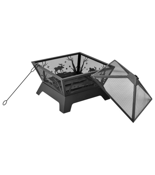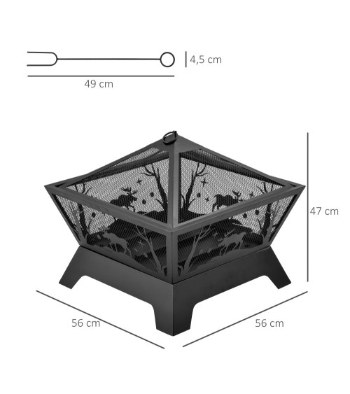 Ce magnifique braséro boule de feu vous permettra de profiter d'une petite braisée lors des fraiches nuits du printemps, de l'été ou de l'automne ! Equipé d'un tisonnier et d'un couvercle pare-étincelles, vous pourrez en profiter en toute sécurité et praticité.Caractéristiques : - Brasero design rustique en métal coloris noir avec motifs cerf et arbre, idéal pour sublimer votre extérieur- Idéal pour créer une ambiance chaleureuse et conviviale lors des nuits fraiches du printemps, de l'été ou de l'automne- Foyer métal résistant aux hautes températures jusqu'à 500 degrés- Le couvercle pare-étincelles empêche les projections- Tisonnier inclus pour déplacer les bûches de bois en toute sécurité- Recommandations d'usage : destiné uniquement à un usage extérieur hors sol en bois et à l'écart des enfants et animaux- Vivement recommandé de porter un équipement de sécurité adapté (gants, etc...) et d'éteindre le braséro après chaque utilisation- Brûler uniquement bûches de bois et charbon. Il est conseillé d'avoir un extincteur à disposition si besoin- Assemblage facile et rapide grâce au manuel de montage illustréSpécifications : - Couleur : noir- Matériau principal : métal- Dim. totales : 56L x 56l x 47H cm- Dim. foyer : 56L x 56l x 20H cm- Dim. couvercle : 51,5L x 51,5l x 18H cm- Dim. tisonnier : 49L x 4,5l cm- Hauteur pieds : 13 cm- Réf : 842-257