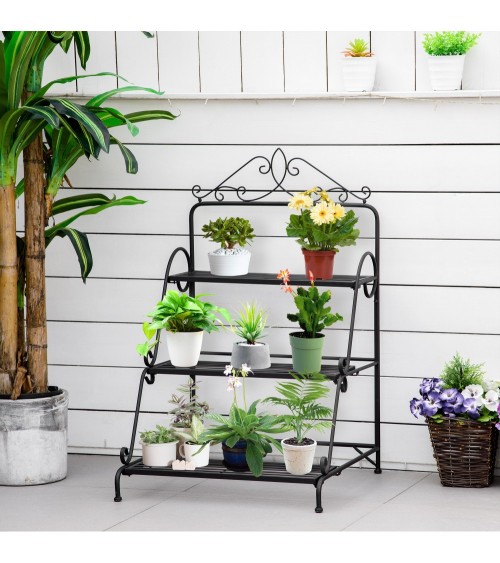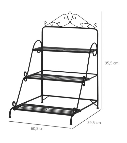 Succombez au porte-plantes en métal noir d'Outsunny pour donner vie à votre espace extérieur. Vous allez adorer son look contemporain en forme d'escalier pour profiter pleinement de vos plantes. Vos différentes plantes seront joliment mis en valeurs sur les 3 niveaux. Il convient parfaitement pour une utilisation à l'intérieur comme à l'extérieur.Caractéristiques :- Étagère à plantes sur 3 niveaux pour le rangement et pour créer une décoration attrayante en présentant des fleurs, bonsaïs, etc.- La forme escalier permet d'utiliser pleinement l'espace en hauteur et de bien mettre en valeur vos plantes- Structure en métal solide et durable- Surface lisse, facile à nettoyer- Idéal pour votre terrasse extérieure, votre jardin ou à l'intérieur de votre maison- Ce support de plantes peut également servir pour ranger des livres, chaussures ou autres- Montage facile et rapide à l'aide du manuel d'assemblage illustré fourniSpécifications :- Couleur : noir- Matériau principal : métal- Dim. totales : 60,5L x 59,5l x 95,5H cm- Dim. étagère : 56,5L x 17,5l cm- Hauteur entre chaque étagère : 25 cm- Hauteur à partir du sol : 8,5 cm- Charge max. recommandée : 20 kg (chaque niveau)- Réf : 845-570BK