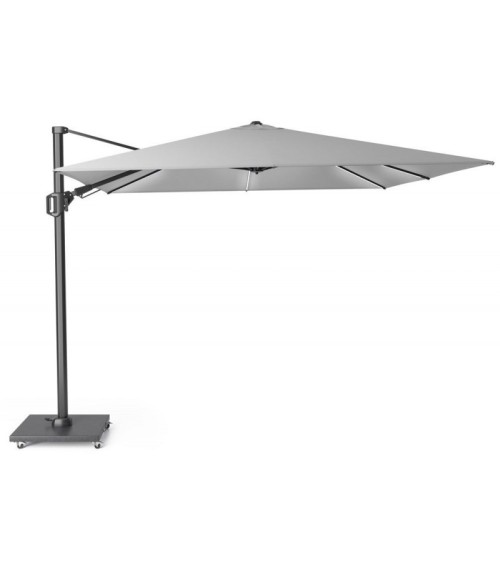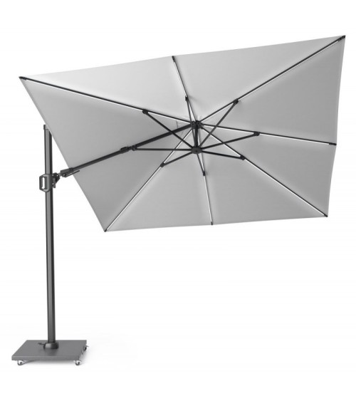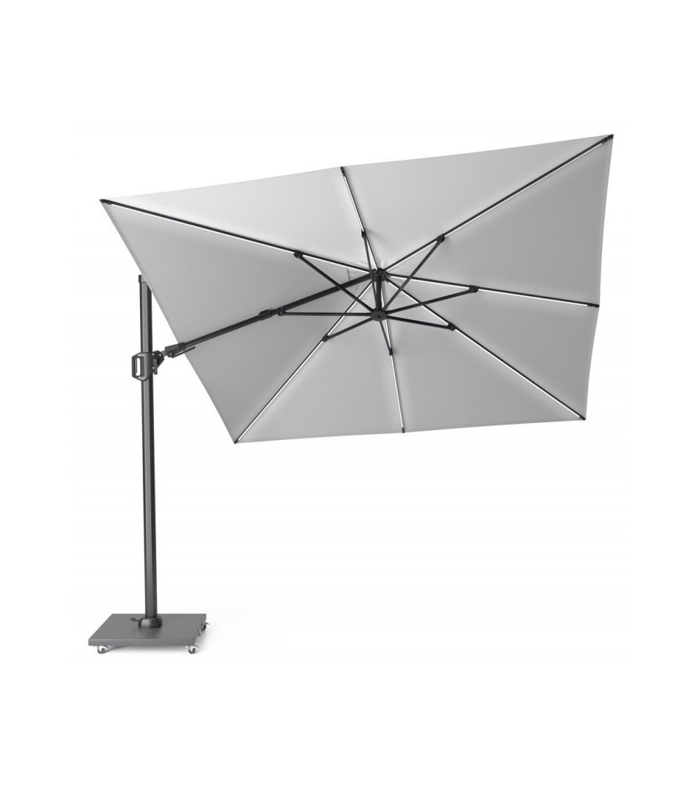 Parasol carré déporté 3x3 m avec baleines lumineuses LED Challenger Glow Platinum. Fonctionne sur batterie (2 batteries fournies rechargeables via câble USB fourni). Double inclinaison, rotatif à 360 degrés. Toile déperlante et dense en polyester de 300g/m², hydrofuge et antisalissures, UPF 35 plus. Disponible en plusieurs couleurs de toile. Ouverture facile par manivelle. Cheminée d'aération. Mât du parasol en aluminium 5,3 x 8,6 x 0,2 x 250 cm. 8 baleines en aluminium. Hauteur : fermé 2m65, ouvert 2m55 (sans pied). Important : pied et housse vendus séparément. Nous conseillons un pied de 90 kilos minimum, 120 kilos en cas d'exposition au vent. Pour protéger et préserver votre parasol nous vous conseillons les housses de protection Aerocover vendues à part.