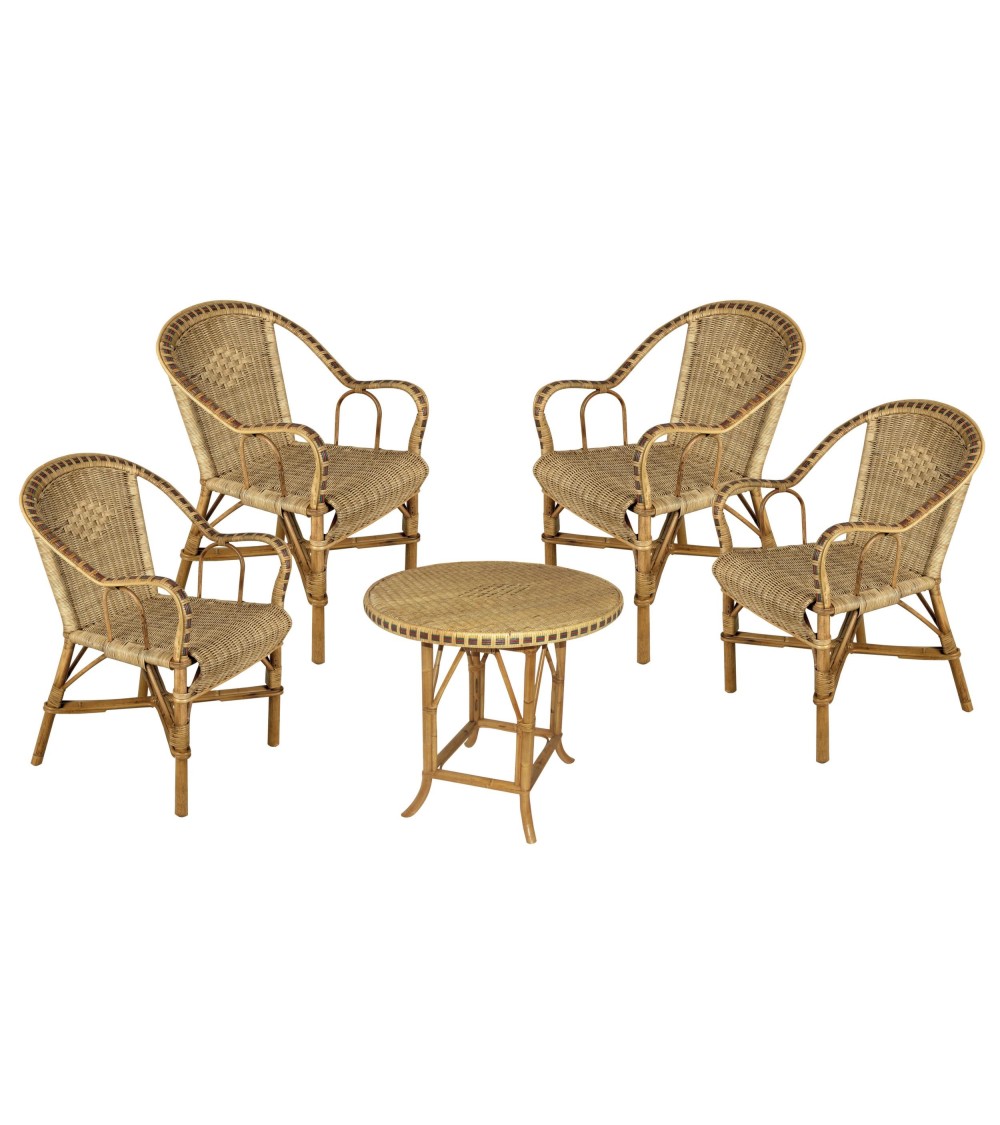 Aspect : Matériau principal : Manau et moelle de rotinDimensions : Diamètre (en cm) : 76Hauteur (en cm) : 80Hauteur d'assise (en cm) : 43Hauteur du fauteuil (en cm) : 81Longueur du fauteuil (en cm) : 60Profondeur (en cm) : 60,00Autres caractéristiques : Compatible extérieur : Oui. Le matériau se patine en cas de longue exposition en extérieur.Composition : 4 fauteuils et 1 tableEntretien : Dépoussiérer régulièrement + effectuer un nettoyage plus en profondeur tous les 3 mois.Livré monté : OuiPoids (en kg) : 28 Salon en manau et rotin Surabaya