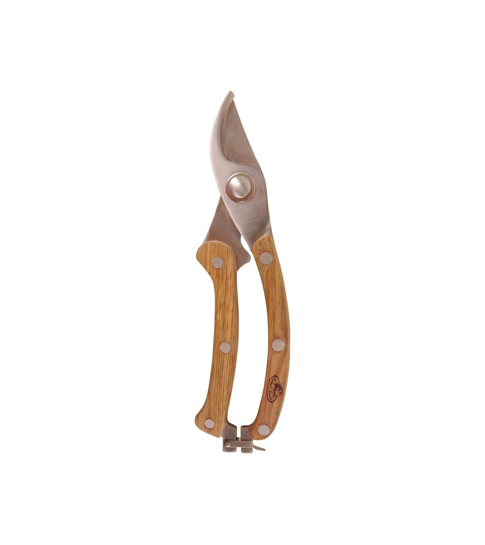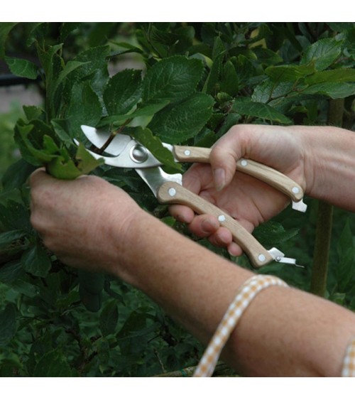 Sécateur en bois et acier inoxydable pour tout couper simplement. Dimensions : 20 x 5 x 1,7 cm
