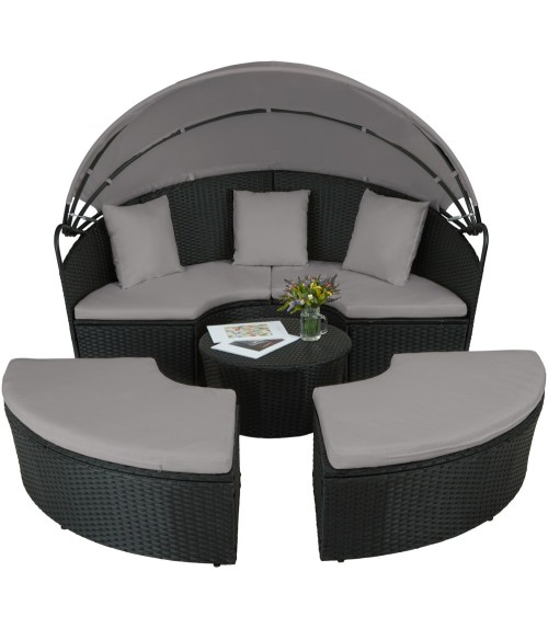 Notre bain de soleil rond modulable SANTORIN tectake mettra à coup sûr une touche d'élégance à votre jardin. Son design raffiné est conçu pour une double utilisation : groupés, les différents éléments font un vaste bain de soleil ou canapé de jardin; séparés, vous avez alors un salon de jardin avec table basse. 2 mobiliers de jardin en 1 ! Abritez-vous de la brise et du soleil avec le pare-soleil rétractable. L'entretien du bain de soleil est facilité grâce à sa structure recouverte de résine tressée. Ce matériau d'aspect similaire au rotin naturel se nettoie à l'aide d'un chiffon humide. Dimensions (lxPxH): environ 172 x 172 x 88 - 132 cmProfondeur d'assise: environ 50 cmÉpaisseur du rembourrage: environ 6 cmDimensions de la table (ØxH): environ 58,5 x 31 cmHauteur d'assise (avec coussin) : environ 37 cmDimensions coussin de dossier (lxPxH): environ 40 x 17 x 40 cmGrammage du pare-soleil: 180 g/m²Pieds réglables en hauteur jusqu'à 1 cmPoids maximal supporté par chaque élément d'assise: 120 kgPoids maximal supporté par la table: 100 kgPoids: env.iron 40 kgMatériaux: acier revêtu par poudre, polyéthylène, 100% polyester, mousse synthétique
