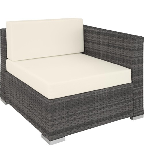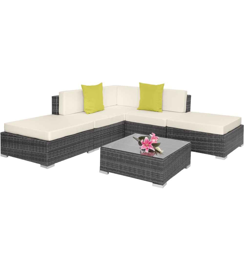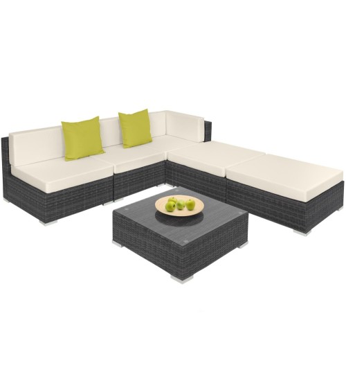 Profitez à fond de l'été à l'extérieur avec notre canapé de jardin PARIS modulable 5 places tectake ! Grand et confortable, il peut être aménagé en différentes configurations : salon de jardin, canapé XXL, double banquette, coin méridienne... à vous de choisir ! Pour encore plus de confort, 2 coussins sont compris dans la livraison. Le canapé est constitué d'une structure en aluminium recouverte de résine tressée. Ce matériau d'aspect similaire au rotin naturel rend l'ensemble à la fois léger, résistant et facile à entretenir. La résine tressée moderne est du plus bel effet aussi bien à l'extérieur sur votre terrasse, qu'à l'intérieur dans un jardin d'hiver, dans une véranda ou même dans votre salon. Contrairement au rotin, la résine tressée ne nécessite que très peu d'entretien : un coup de chiffon humide et le tour est joué ! Les housses des grands coussins sont lavables et peuvent passer à la machine en cas de tâche. Leur surface est par ailleurs imperméabilisée pour ne pas laisser rentrer l'humidité. Nous vous recommandons néanmoins de retirer les coussins lorsqu'il pleut pour une meilleure durée de vie. Poufs : Dimensions avec le coussin (LxPxH) : 75 x 75 x 36,5 cmPoids : environ 4,4 kg Poids maximal supporté : 120 kgFauteuils : Dimensions (LxPxH) : environ 64 x 75 x 60 cm Poids : environ 5,2 kg Poids maximal supporté : 120 kgFauteuil dangle : Dimensions (LxPxH) : environ 75 x 75 x 60 cm Poids : environ 8,1 kgPoids maximal supporté : 120 kgCoussin supplémentaire (vert): environ 42 x 42 x 15 cmTable : Dimensions (LxPxH) : environ 70 x 70 x 26 cm Poids : environ 8 kgPoids maximal supporté : 120 kgMatériaux : Structure : aluminiumRevêtement : résine tresséeCoussins : 100% polyesterLépaisseur de rembourrage des coussins est denviron 10 cm