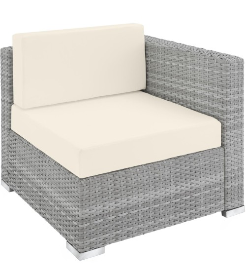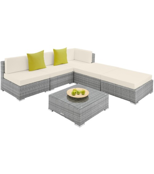 Profitez à fond de l'été à l'extérieur avec notre canapé de jardin PARIS modulable 5 places tectake ! Grand et confortable, il peut être aménagé en différentes configurations : salon de jardin, canapé XXL, double banquette, coin méridienne... à vous de choisir ! Pour encore plus de confort, 2 coussins sont compris dans la livraison. Le canapé est constitué d'une structure en aluminium recouverte de résine tressée. Ce matériau d'aspect similaire au rotin naturel rend l'ensemble à la fois léger, résistant et facile à entretenir. La résine tressée moderne est du plus bel effet aussi bien à l'extérieur sur votre terrasse, qu'à l'intérieur dans un jardin d'hiver, dans une véranda ou même dans votre salon. Contrairement au rotin, la résine tressée ne nécessite que très peu d'entretien : un coup de chiffon humide et le tour est joué ! Les housses des grands coussins sont lavables et peuvent passer à la machine en cas de tâche. Leur surface est par ailleurs imperméabilisée pour ne pas laisser rentrer l'humidité. Nous vous recommandons néanmoins de retirer les coussins lorsqu'il pleut pour une meilleure durée de vie. Poufs : Dimensions avec le coussin (LxPxH) : 75 x 75 x 36,5 cmPoids : environ 4,4 kg Poids maximal supporté : 120 kgFauteuils : Dimensions (LxPxH) : environ 64 x 75 x 60 cm Poids : environ 5,2 kg Poids maximal supporté : 120 kgFauteuil dangle : Dimensions (LxPxH) : environ 75 x 75 x 60 cm Poids : environ 8,1 kgPoids maximal supporté : 120 kgCoussin supplémentaire (vert): environ 42 x 42 x 15 cmTable : Dimensions (LxPxH) : environ 70 x 70 x 26 cm Poids : environ 8 kgPoids maximal supporté : 120 kgMatériaux : Structure : aluminiumRevêtement : résine tresséeCoussins : 100% polyesterLépaisseur de rembourrage des coussins est denviron 10 cm