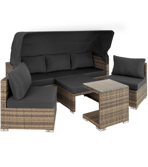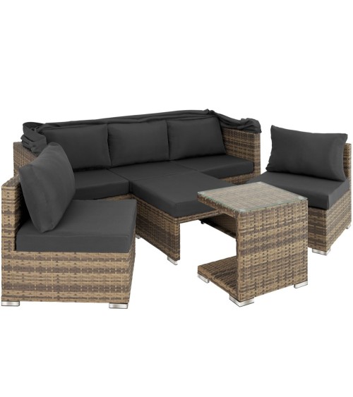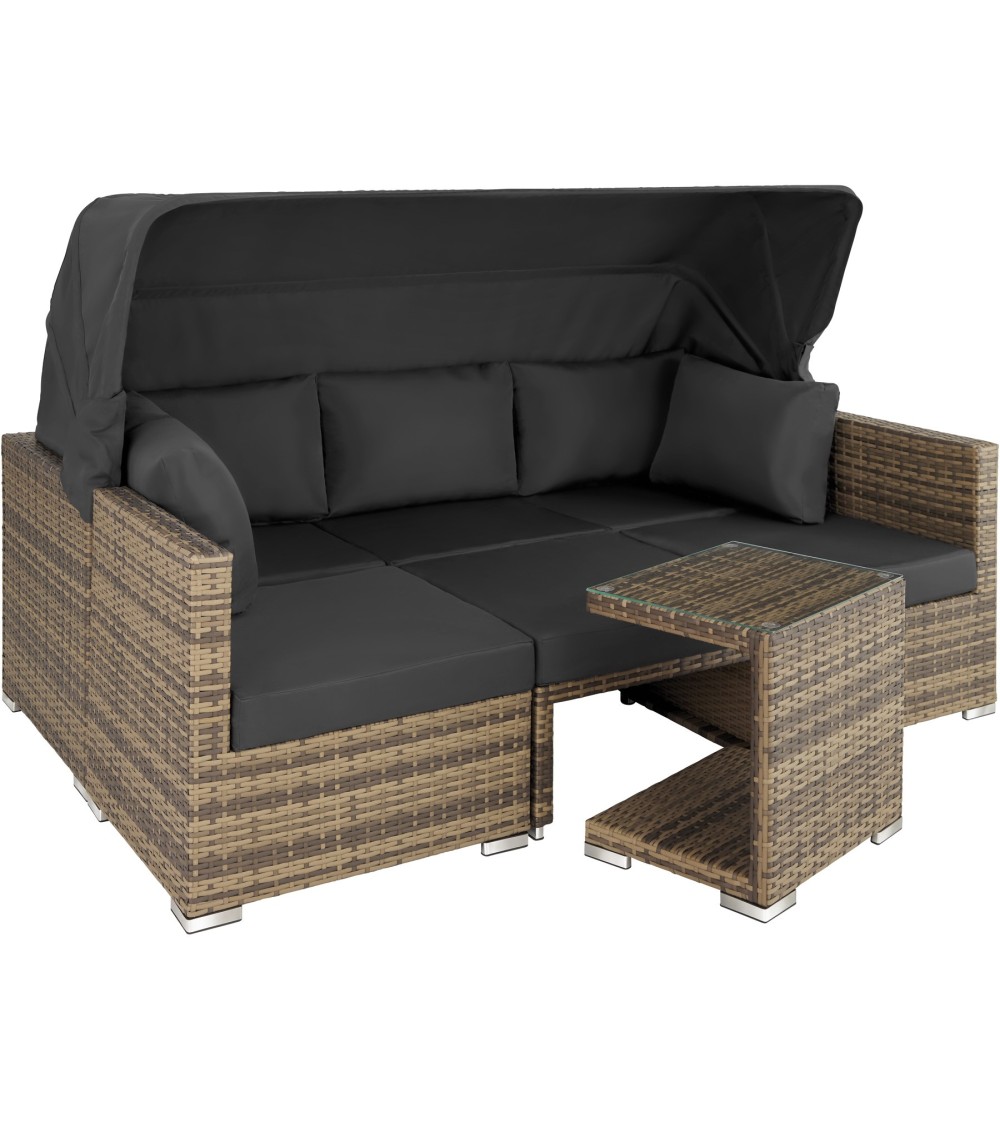 Profitez d'une ambiance lounge avec notre canapé de jardin SAINT MARIN tectake ! Ce mobilier de jardin original ajoutera à coup sûr du cachet à votre terrasse. Constitué de plusieurs éléments, le canapé est modulable : aménagez-vous un canapé XXL de pacha, une méridienne pour discuter avec des convives installés sur des fauteuils, un bain de soleil solo avec dossier réglable pour bronzer ou faire la sieste à l'ombre du large pare-soleil protecteur. Son must : la table d'appoint avec son plateau de verre qui vient se glisser près de vous, idéal pour l'apéritif ou le goûter ! La structure du canapé de jardin, des fauteuils, du pouf et de la table est en aluminium recouverte de résine tressée haut de gamme. Ce matériau d'apparence similaire au rotin naturel s'entretient facilement en plus d'être très léger. Canapé :Dimensions avec pare-soleil relevé (lxPxH) : environ 199 x 68 x 131 cm.