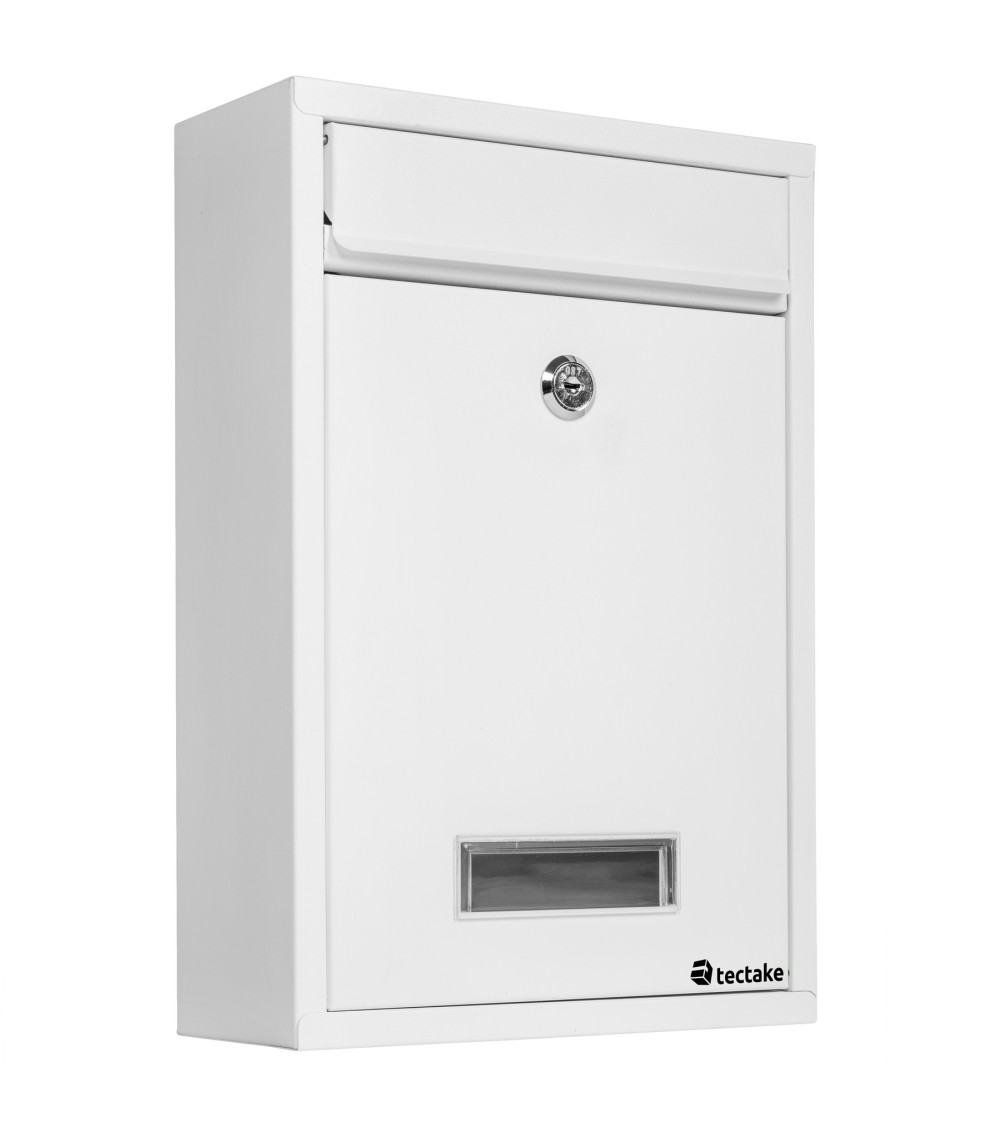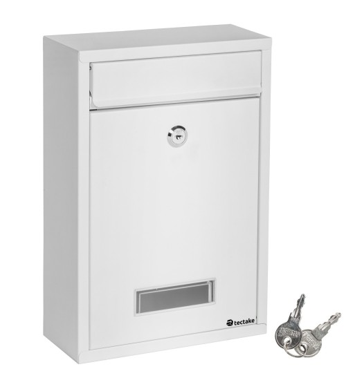 TECTAKE Boite aux lettres, Boite aux lettres design Basic, Boite aux lettres Acier Murale 215 mm x 90 mm x 320 mm. Dimensions totales (LxlxH) : environ 215 mm x 90 mm x 320 mm. Ouverture maximum pour lettres et colis (lxh) : environ 165 mm x 30 mm. Ouverture par clapet (lxh) : environ 180 cm x 225 cm. Plaque d'identification (lxh) : 75 mm x 30 mm. Écart horizontal entre les trous : environ 115 mm. Écart vertical entre les trous : environ 200 mm. Matériau : Acier.Poids : environ 1,0 Kg.