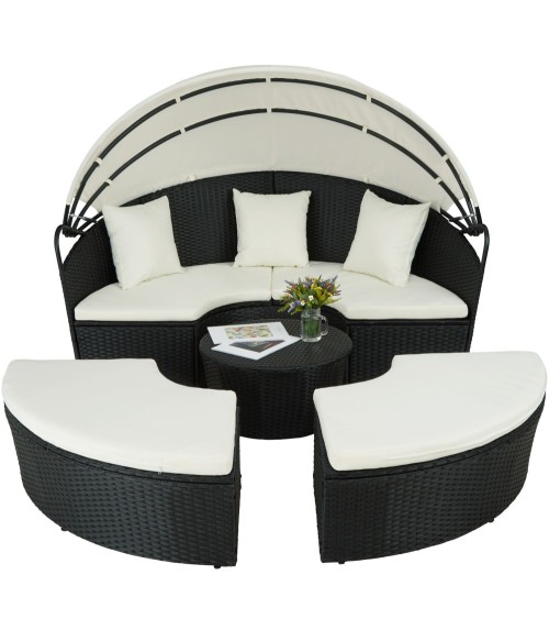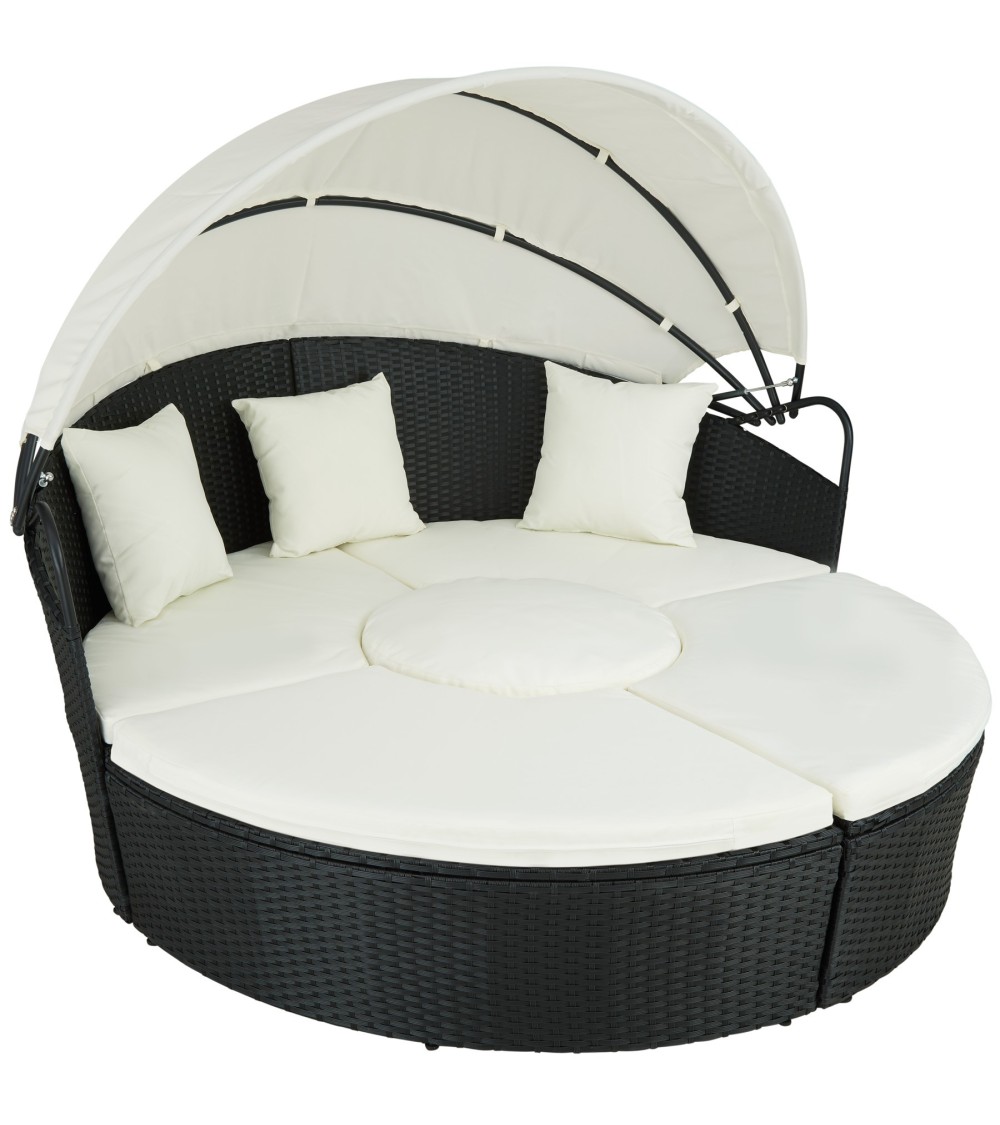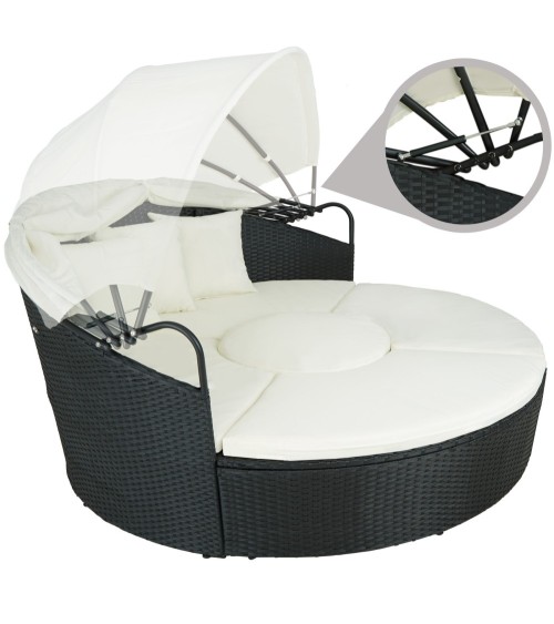 Salon de Jardin, Chaise Longue, Transat, Bain de Soleil Coquille en Aluminium et Résine Tressée + Pare Soleil + 3 Coussins TECTAKE. Ce canapé lit de jardin d'extérieur rond, modulable, en Aluminium et Poly Rotin transformera votre jardin, votre terrasse, votre jardin d'hiver, votre balcon ou SPA en oasis de bien-être. Le toit pare-soleil pliable (Rabattable) offre un ombrage agréable pendant les belles journées ensoleillées et vous protège efficacement du vent. Utilisable comme ensemble table / fauteuils pour recevoir ses amis ou comme lit confortable pour profiter d'un moment de détente. Changez la disposition de ce salon de jardin en un tour de main. Ce bain de soleil en résine tressée est un véritable accroche regard. C'est un must absolu dans votre espace bien-être. Largeur totale : environ 180 cm. Hauteur totale avec le pare-soleil déplié : environ 138 cm. Hauteur totale avec le pare-soleil replié : environ 83 cm. Profondeur totale : environ 161 cm. Profondeur sans table et fauteuils : environ 81 cm. Hauteur d'assise avec coussin : environ 35 cm.Poids : environ 36 kg.