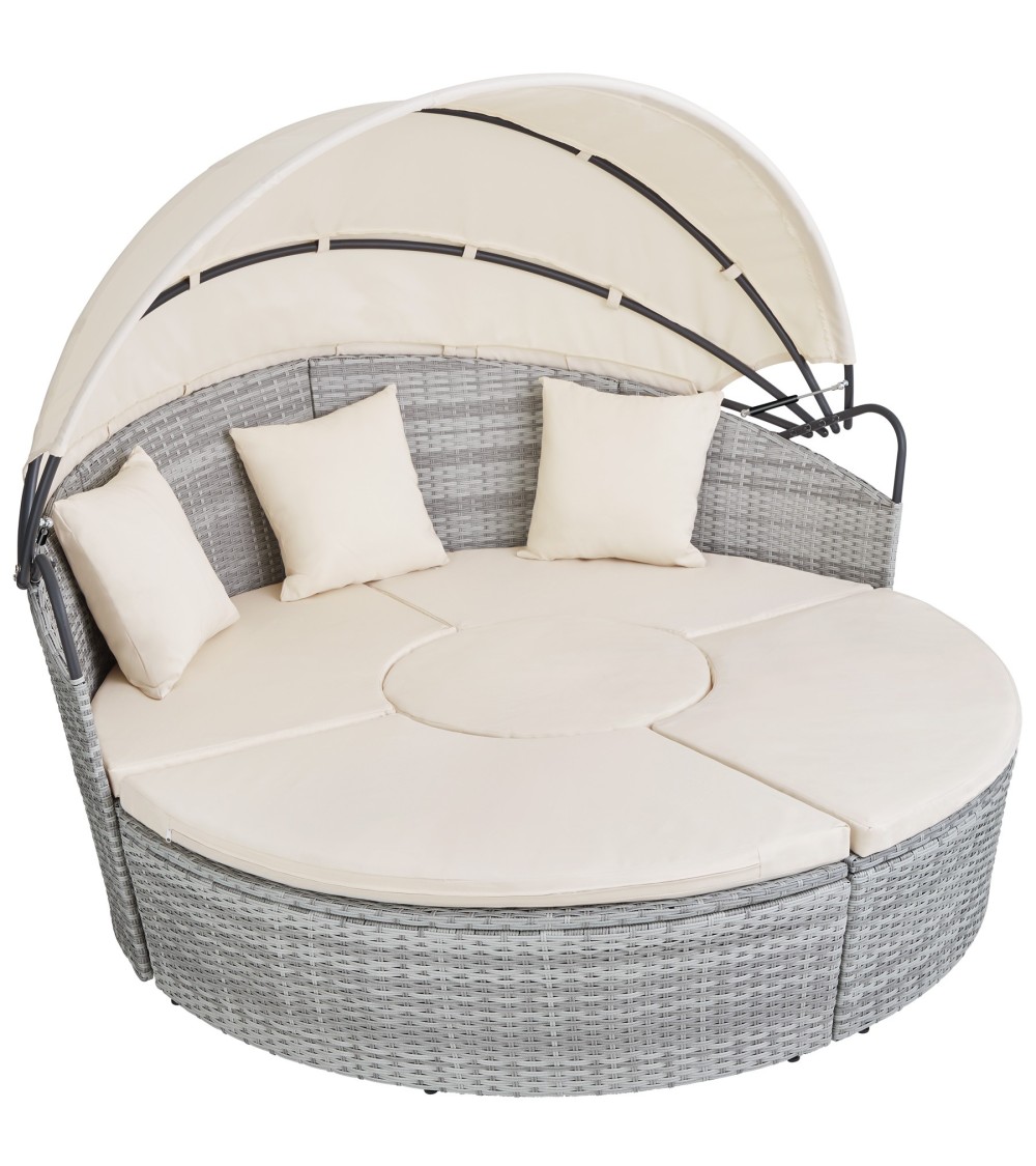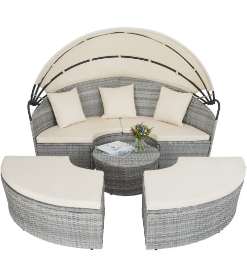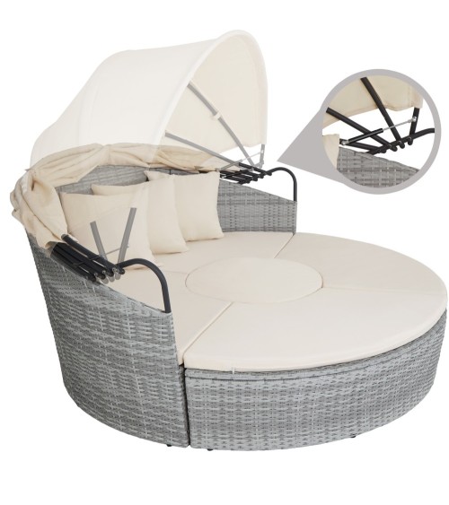 Salon de Jardin, Chaise Longue, Transat, Bain de Soleil Coquille en Aluminium et Résine Tressée + Pare Soleil + 3 Coussins TECTAKE. Ce canapé lit de jardin d'extérieur rond, modulable, en Aluminium et Poly Rotin transformera votre jardin, votre terrasse, votre jardin d'hiver, votre balcon ou SPA en oasis de bien-être. Le toit pare-soleil pliable (Rabattable) offre un ombrage agréable pendant les belles journées ensoleillées et vous protège efficacement du vent. Utilisable comme ensemble table / fauteuils pour recevoir ses amis ou comme lit confortable pour profiter d'un moment de détente. Changez la disposition de ce salon de jardin en un tour de main. Ce bain de soleil en résine tressée est un véritable accroche regard. C'est un must absolu dans votre espace bien-être. Largeur totale : environ 180 cm. Hauteur totale avec le pare-soleil déplié : environ 138 cm. Hauteur totale avec le pare-soleil replié : environ 83 cm. Profondeur totale : environ 161 cm. Profondeur sans table et fauteuils : environ 81 cm. Hauteur d'assise avec coussin : environ 35 cm.Poids : environ 36 kg.