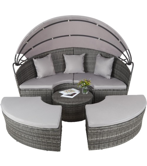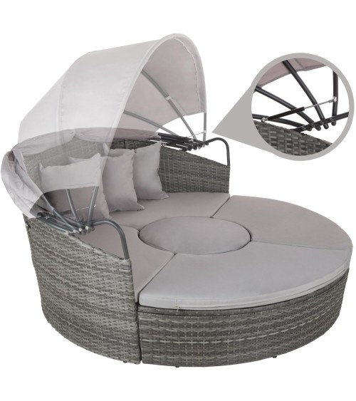 Salon de Jardin, Chaise Longue, Transat, Bain de Soleil Coquille en Aluminium et Résine Tressée + Pare Soleil + 3 Coussins TECTAKE. Ce canapé lit de jardin d'extérieur rond, modulable, en Aluminium et Poly Rotin transformera votre jardin, votre terrasse, votre jardin d'hiver, votre balcon ou SPA en oasis de bien-être. Le toit pare-soleil pliable (Rabattable) offre un ombrage agréable pendant les belles journées ensoleillées et vous protège efficacement du vent. Utilisable comme ensemble table / fauteuils pour recevoir ses amis ou comme lit confortable pour profiter d'un moment de détente. Changez la disposition de ce salon de jardin en un tour de main. Ce bain de soleil en résine tressée est un véritable accroche regard. C'est un must absolu dans votre espace bien-être. Largeur totale : environ 180 cm. Hauteur totale avec le pare-soleil déplié : environ 138 cm. Hauteur totale avec le pare-soleil replié : environ 83 cm. Profondeur totale : environ 161 cm. Profondeur sans table et fauteuils : environ 81 cm. Hauteur d'assise avec coussin : environ 35 cm.Poids : environ 36 kg.