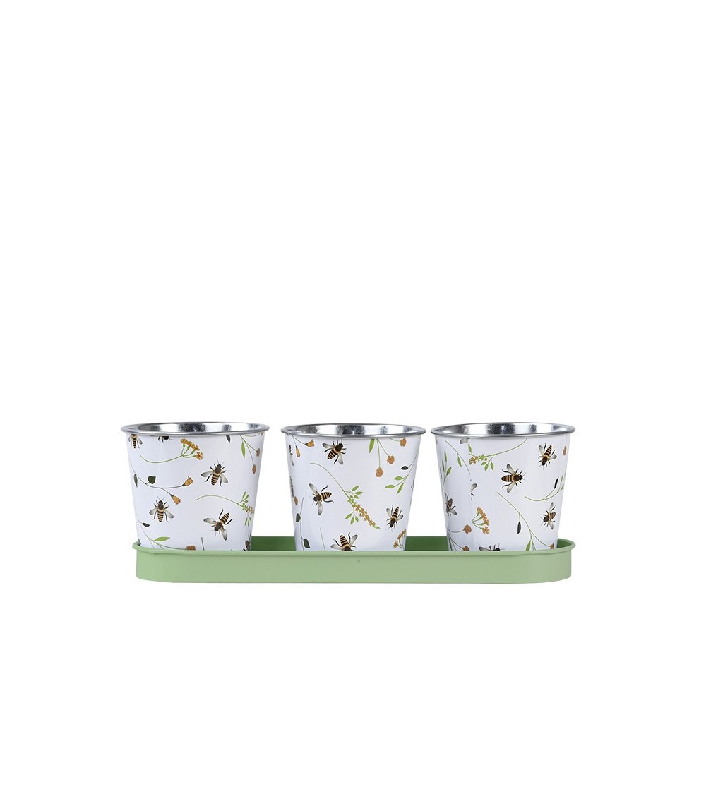 Laissez libre cours à votre imagination ! Ce joli set de pots en zinc imprimés abeilles accueillera vos petites plantations et s'intégrera parfaitement dans votre univers par la douce décoration qu'il procure. Dimensions : 32 x 10,6 x 10,9 cm