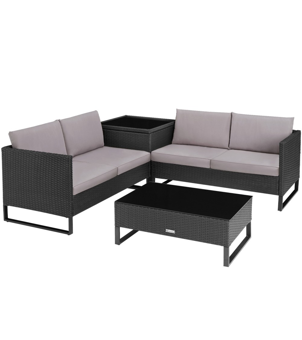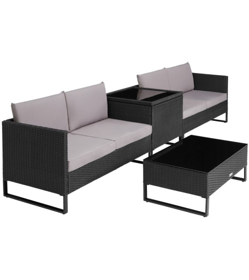 Façonnez votre propre oasis de détente avec le salon en rotin Ostuni confortable de tectake. Les épais coussins au niveau de lassise et du dossier épousent en douceur les courbes du corps et se conservent en toute simplicité dans leur grande boîte de rangement après utilisation. Avec son élégant plateau en verre trempé noir, la table basse représente le point central de ce salon facile dentretien. Le support en acier revêtu par poudre et la résine tressée résistante offrent à cet ensemble de quatre meubles une extrême robustesse et une grande résistance. Le superbe salon en rotin Ostuni de tectake, la garantie du bien-être et de lharmonie. Canapé Dimensions totales (lxPxH) ; env. 128,5 x 66 x 63,5 ;cm Hauteur dassise (avec coussin dassise) ; env. 40,5 ;cm Coussin dassise (lxPxH) ; env. 62 x 62 x 9 ;cm Dimensions coussin de dos (lxPxH) ; env. 62 x 9 x 37,5 ;cm Hauteur du dossier ; env. 32 ;cm Largeur accoudoirs ; env. 4,5 ;cm Support en acier (Lxl) ; env. 3,5 ;x ;1,5 ;cm Réglage des pieds en plastique ; env. 1,2 ;cm Capacité de charge ; 250 ;kg Poids (avec coussins) ; env. 18,2 ;kg Matériaux ; acier revêtu par poudre, polyéthylène, mousse synthétique, 100 ;% polyester ; Boîte de rangement Dimensions totales (lxPxH) ; env. 66 x 66 x 63 ;cm Dimensions intérieures (lxPxH) ; env. 64 x 64 x 46,5 ;cm Hauteur avec le couvercle ouvert ; env. 117 ;cm Surface en verre (lxP) ; 593 x 593 ;mm Support en acier (Lxl) ; env. 3,5 ;x ;1,5 ;cm Réglage des pieds en plastique ; env. 1,2 ;cm Capacité de charge ; 45 ;kg Poids ; env. 11,2 kg.