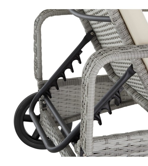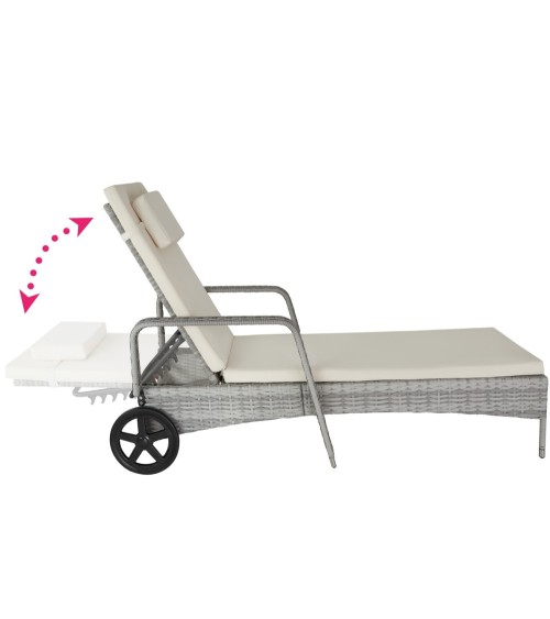 Chaise longue, Transat, Bain de soleil en Aluminium et Poly Rotin avec 2 Roues. Avec cette chaise longue au style lounge, vous transformez votre jardin, votre terrasse, votre jardin d'hiver, votre balcon ou votre zone de détente en une oasis de bien-être. Détendez-vous à toute heure de la journée ! Véritable attrape regard, elle ne passe pas inaperçue sur votre balcon, dans votre sauna ou dans votre espace bien être. Un design simple ainsi qu'une association innovante de divers matériaux la rendent élégante. Cette chaise longue crée une ambiance magnifique. Les roues disposées au niveau de la tête du bain de soleil facilitent le transport. Le dossier est réglable à 6 hauteurs différentes et peut être ainsi orienté de manière optimale par rapport au soleil. Le support stable en aluminium et le poly rotin facile à entretenir conviennent aussi bien pour une utilisation à l'extérieur comme à l'intérieur. Le sommier confortable et amovible ainsi que l'oreiller vous apporte un confort de couchage maximal. Dimensions totales (LxlxH) : environ 196 cm x 72 cm x 57 - 94,5 cm. Surface de couchage (Lxl) : environ 196 cm x 55,5 cm. Hauteur du dossier: environ 76 cm.Dimensions appuie-tête (lxH): env. 40 x 20 cm.Épaisseur du rembourrage : environ 5 cm. Hauteur des accoudoirs : environ 57 cm. Largeur des accoudoirs: env. 6 cm. Hauteur de couchage avec rembourrage: env. 37 cm. Roulettes (LxØ): env. 24 x 3 cm. Capacité de charge: 150 kg. Matériaux : Poly Rotin. / Rembourrage : 100 % Polyester. / Aluminium. Dossier réglable à 6 hauteurs différentes : 0°, 20°, 30°, 40°, 50°, 60°. Poids : environ 11,1 kg.