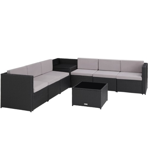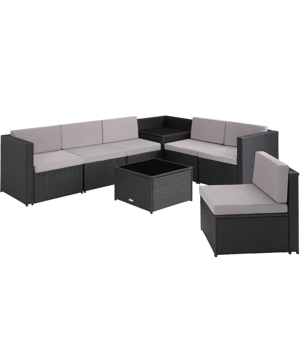 Avec la myriade de combinaisons quil offre, le salon en rotin Verona de tectake est polyvalent et confortable. Vous avez plusieurs solutions pour habiller vos extérieurs avec le salon de jardin Verona. Chacun des huit éléments sallie en toute flexibilité avec le reste de lensemble selon vos besoins et la place que vous avez chez vous. La résine tressée résistante et durable est parfaitement assortie aux coussins douillets pour lassise et le dos. Ce groupe robuste est complété par une boîte de rangement pratique et une table basse, dont le verre trempé noir ajoute à lensemble une jolie touche délégance. Fauteuil/fauteuil dangle Dimensions totales fauteuil (lxPxH) : env. 58 x 66 x 66 cm Dimensions totales fauteuil dangle (lxPxH) : env. 66 x 66 x 66 cm Hauteur dassise (avec rembourrage) : env. 41,5 cm Coussin dassise (lxPxH) : env. 58 x 58 x 8 cm Coussin de dos (lxPxH) : env. 58 x 8 x 30 cm Hauteur dossier (avec coussin dassise) : env. 24,5 cm Pieds (lxP) : env. 1,5 x 1,5 cm Capacité de charge : 120 kg Poids fauteuil (avec rembourrage) : env. 8 kg Poids fauteuil dangle (avec rembourrage) : env. 10 kg Matériaux : acier revêtu par poudre, polyéthylène, mousse synthétique, 100 % polyester Boîte de rangement Dimensions totales (lxPxH) : env. 66 x 66 x 66 cm Dimensions intérieures (lxPxH) : env. 64 x 64 x 46,5 cm Pieds (lxP) : env. 1,5 x 1,5 cm Capacité de charge : 15 kg Poids : env. 11,2 kg Matériaux : acier revêtu par poudre, polyester Table Dimensions totales (Lxlxh) : env. 58 x 58 x 37 cm.