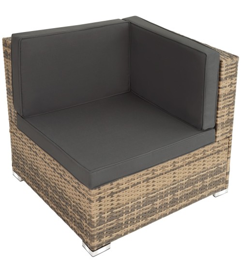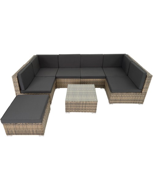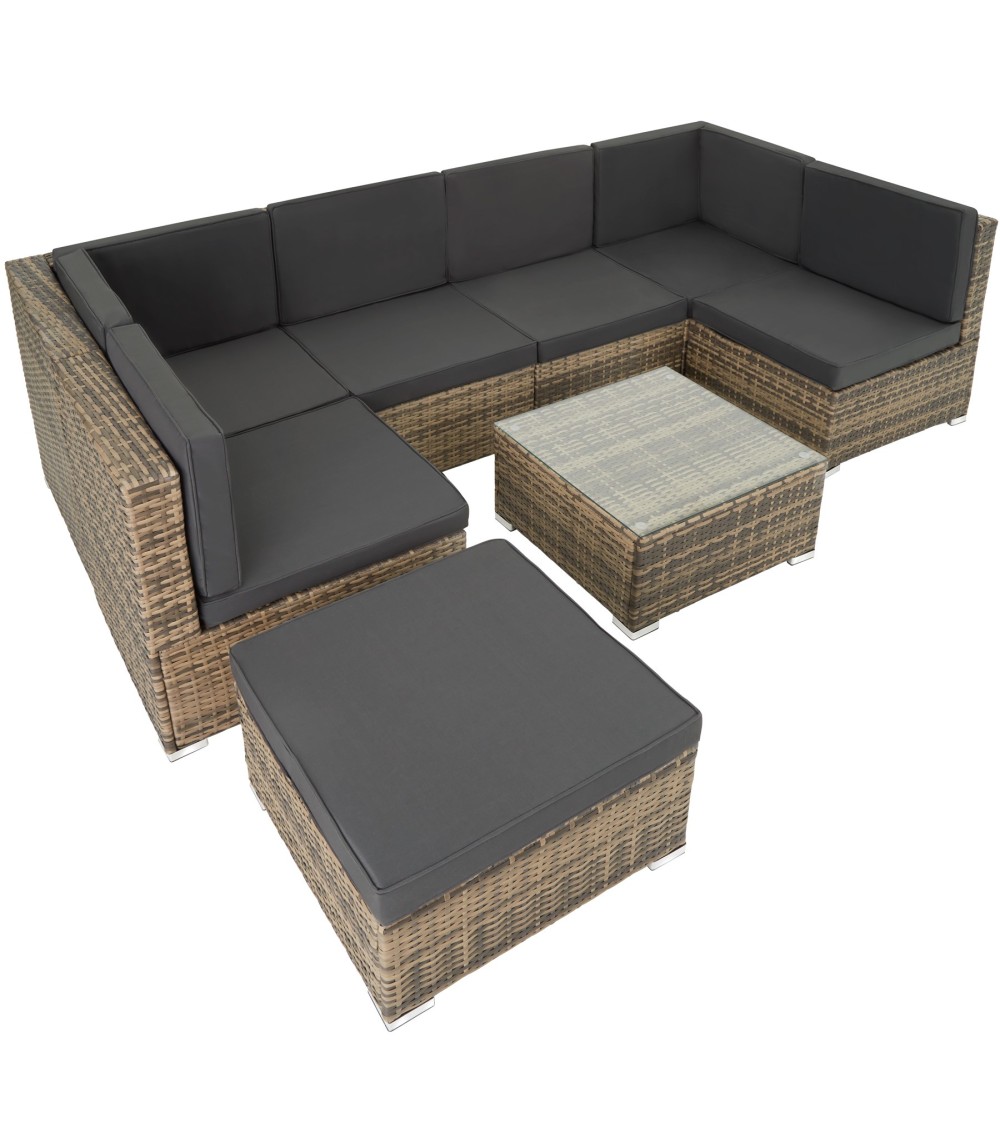 Que diriez-vous de vous détendre sur votre terrasse après une longue journée ? Ce superbe salon de jardin modulable allie luxe et confort ! Son design tendance et élégant s'intègre également parfaitement pour décoration intérieure. Adoptez l'ambiance lounge dans votre salon ! La construction stable avec des vis en acier inoxydable et du Poly rotin résistant aux intempéries est parfaite pour l'extérieur. La résine tressée en dégradé de gris et les housses de coussin amovibles sont parfaitement assorties et sont faciles d'entretien. La table à hauteur d'assise est dotée d'un plateau en verre amovible. Profitez des moments de détente dans ce luxueux salon de jardin. ** Sièges et Tabouret : Dimensions totales du siège (lxPxH) : environ 59,5 cm x 69,5 cm x 68 cm. Dimensions totales du siège d'angle (lxPxH) : environ 69,5 cm x 69,5 cm x 68 cm. Surface d'assise (lxP) : environ 59,5 cm x 59,5 cm. Hauteur dossier : environ 38,5 cm. Hauteur d'assise : environ 29,5 cm. Épaisseur coussins d'assise et de dossier : environ 7 cm. Capacité de charge maximale par siège : 120 kg. Dimensions totales du tabouret (lxPxH) : environ 59,5 x 59,5 x 29 cm. Matériau coussin d'assise : 100 % Polyester. Matériaux : Acier / Polyéthylène. Poids du tabouret : environ 5,9 kg. Poids par siège : environ 7,2 kg. Poids du siège d'angle : environ 10,2 kg. ** Table : Dimensions totales (lxPxH) : environ 59,5 cm x 59,5 cm x 29 cm. Épaisseur plateau en verre : environ 5 mm. Matériaux : Acier / Polyéthylène / Verre. Poids de la table (plateau en verre inclus) : environ 9,3 kg.