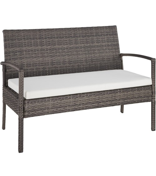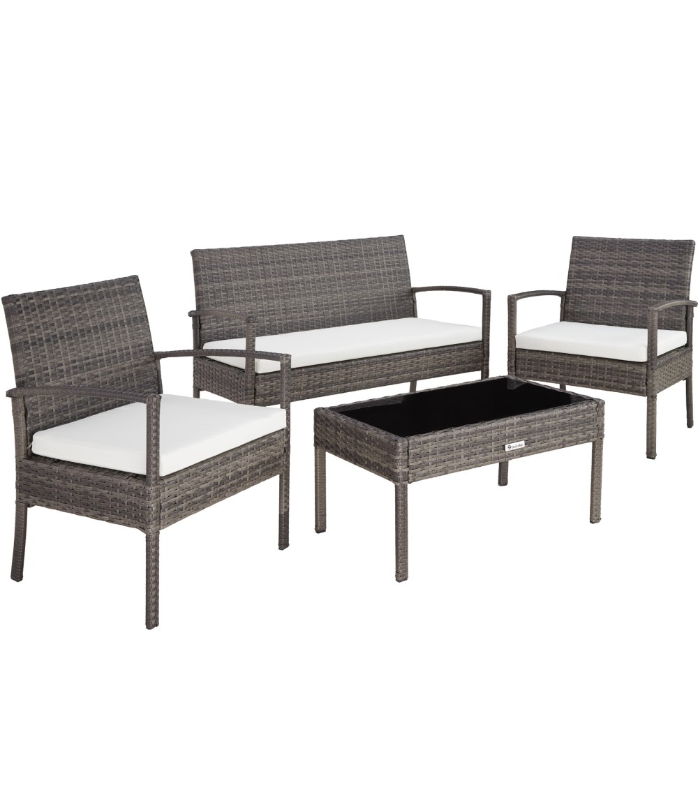 Salon de jardin SPARTE Salon de jardin résine - 2 Fauteuils, 1 Canapé, 1 Table en Résine Tressée TECTAKE. FAUTEUIL : Hauteur de l'assise : 35 cm. Hauteur du fauteuil : 77 cm. Largeur du fauteuil : 57 cm. Surface de l'assise : environ 49,5 cm x 44 cm. Epaisseur du rembourrage : environ 5,5 cm.Poids : environ 5,5 kg. CANAPÉ : Hauteur de l'assise : 35 cm. Hauteur du canapé : 77 cm. Largeur du canapé : 109 cm. Surface de l'assise : 44 cm x 101 cm. Epaisseur du rembourrage : environ 5,5 cm.Poids : environ 8 kg. TABLE : Hauteur : 38 cm. Surface : 75 cm x 40 cm. Plateau en verre : environ 67 cm x 35,5 cm x 0,5 cm. Épaisseur du plateau : 0,4 cm. Poids table + plateau en verre : environ 6 kg.