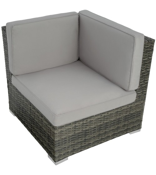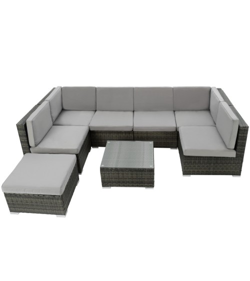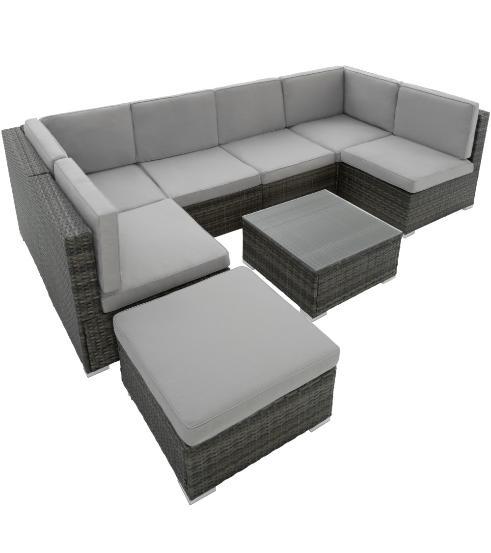 Que diriez-vous de vous détendre sur votre terrasse après une longue journée ? Ce superbe salon de jardin modulable allie luxe et confort ! Son design tendance et élégant s'intègre également parfaitement pour décoration intérieure. Adoptez l'ambiance lounge dans votre salon ! La construction stable avec des vis en acier inoxydable et du Poly rotin résistant aux intempéries est parfaite pour l'extérieur. La résine tressée en dégradé de gris et les housses de coussin amovibles sont parfaitement assorties et sont faciles d'entretien. La table à hauteur d'assise est dotée d'un plateau en verre amovible. Profitez des moments de détente dans ce luxueux salon de jardin. ** Sièges et Tabouret : Dimensions totales du siège (lxPxH) : environ 59,5 cm x 69,5 cm x 68 cm. Dimensions totales du siège d'angle (lxPxH) : environ 69,5 cm x 69,5 cm x 68 cm. Surface d'assise (lxP) : environ 59,5 cm x 59,5 cm. Hauteur dossier : environ 38,5 cm. Hauteur d'assise : environ 29,5 cm. Épaisseur coussins d'assise et de dossier : environ 7 cm. Capacité de charge maximale par siège : 120 kg. Dimensions totales du tabouret (lxPxH) : environ 59,5 x 59,5 x 29 cm. Matériau coussin d'assise : 100 % Polyester. Matériaux : Acier / Polyéthylène. Poids du tabouret : environ 5,9 kg. Poids par siège : environ 7,2 kg. Poids du siège d'angle : environ 10,2 kg. ** Table : Dimensions totales (lxPxH) : environ 59,5 cm x 59,5 cm x 29 cm. Épaisseur plateau en verre : environ 5 mm. Matériaux : Acier / Polyéthylène / Verre. Poids de la table (plateau en verre inclus) : environ 9,3 kg.