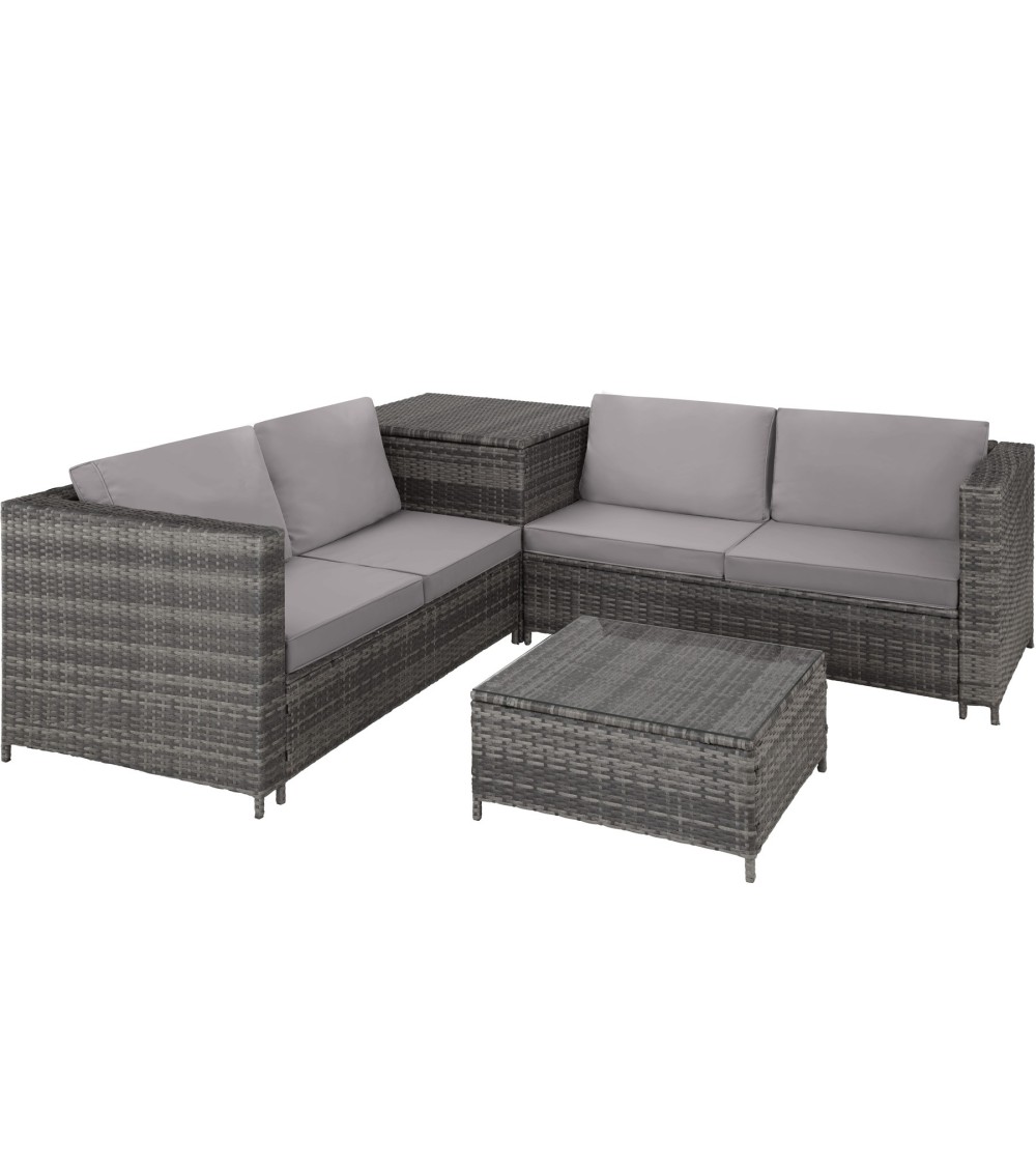 Installez-vous confortablement dans notre canapé de jardin SIENNE 4 places tectake ! L'élégance de son design contemporain fait que ce salon de jardin va aussi bien au jardin sur votre terrasse qu'à l'intérieur de votre maison sous la véranda. Pour créer une ambiance lounge conviviale en famille ou entre amis, faites-en un canapé d'angle. Si vous préférez avoir un canapé XXL, disposez les deux parties en long. Vous apprécierez son assise confortable avec de grands coussins moelleux qui invitent à la détente. La structure de ce mobilier de jardin est en acier recouverte de résine tressée. Ce matériau alternatif au rotin naturel ne nécessite que très peu d'entretien. La résine tressée est en plus très légère, vous pouvez donc bouger la table, le coffre de rangement et le canapé en toute facilité. Pour le remisage hivernal ou lorsqu'il pleut, le coffre de jardin accueille les coussins. Canapés :Dimensions totales (lxPxH) : environ 140 x 75 x 65,5 cm Poids (avec coussins) : environ 17,2 kg Poids maximal supporté : 200 kg Surface d'assise (lxP) : environ 130 x 65 cmHauteur d'assise : environ 30 cm Dimensions des coussins d'assise (lxP) : environ 65 x 65 cm Dimensions des coussins du dossier (lxP) : environ 65 x 40 cm Épaisseur des coussins : environ 8 cm Coffre de rangement : Dimensions (LxlxH) : environ 75 x 75 x 65,5 cm Poids : environ 14 kg Poids maximal supporté : 20 kg Table : Dimensions totales table (LxlxH) : environ 65 x 65 x 31 cm Dimensions plateau de verre (lxPxH) : environ 64,3 x 64,3 x 05 cm Poids (avec plateau de verre) : environ 10 kg Poids maximal supporté : 45 kg Matériaux : Structure : acier revêtu par poudre, polyéthylène Coussins : 100 % polyester.