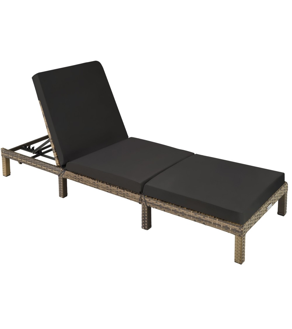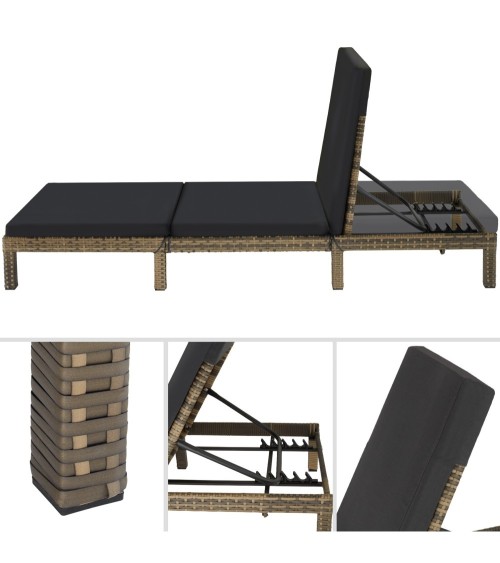 Chaise longue, Transat, Bain de Soleil Réglable en Acier et Résine Tressée - 1 Place - 196 cm x 66 cm x 22 cm TECTAKE. Avec cette chaise longue en Poly Rotin (Résine Tressée), transformez votre jardin, votre terrasse, votre jardin d'hiver, votre balcon ou votre zone de détente en une oasis de bien être. Détendez-vous à toute heure de la journée ! Son design sobre ainsi qu'une association innovante de divers matériaux la rendent élégante. Ce transat est un véritable attrape regards pour tous les amateurs de soleil. Le dossier est réglable à 5 hauteurs différentes et peut être ainsi orienté de manière optimale par rapport au soleil. Le support stable en acier et le poly rotin facile à entretenir conviennent aussi bien pour une utilisation à l'extérieur comme à l'intérieur. Le coussin confortable et amovible vous apporte un confort de couchage maximal. Dimensions totales : (LxlxH) : environ 196 cm x 66 cm x 22 cm.Dimensions du coussin (LxlxH) : environ 189 cm x 64 cm x 5 cm.Dossier réglable à 5 positions différentes (hauteur) : d'environ 60 cm (1er niveau) à 80 cm (5ème niveau).Matériaux : Poly Rotin. / Acier. / Coussin 100 % Polyester.Poids: environ 15 kg.