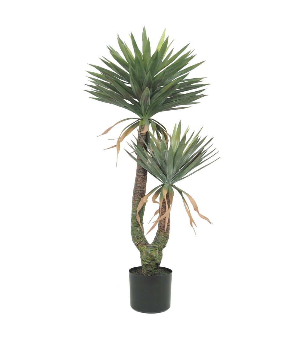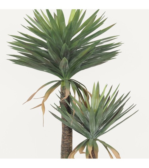 Produit à usages professionnels et particuliers.Vous recherchez une ambiance tropicale pour votre décoration dintérieur ?Craquez pour ce yucca exotique dune hauteur de 150cm, il apportera une Jungle Touch à votre intérieur.Grâce à ses 2 troncs parfaitement imités, il deviendra vite la pièce maîtresse de votre décoration. Il apportera de la hauteur et du relief à votre lieu de vie.Ses feuilles effet fanées lui donne un effet très réaliste qui bluffera votre entourage !Mariez votre Yucca artificiel avec un bananier pour renforcer lambiance exotique, vous pouvez également lassocier à des graminées pour une ambiance tropicale chic.Nhésitez pas à accompagner votre plante artificielle dun cache-pot au style tropical ou encore bohème, il ajoutera une touche doriginalité à votre décoration.Ce Yucca artificiel sera idéal pour toutes vos pièces. Il décorera à merveille votre salle de restaurant, vos bureaux ou encore votre réception d'hôtel.Spécificités :- Envergure : 65cm- 2 Troncs- Nombre de feuilles vertes : 159- Nombre de feuilles effet fané : 12- Hauteur totale : 150cm- Hauteur du tronc : 8cm- Diamètre du tronc : 10cm- Diamètre du pot : 22cm x Hauteur 18,5cm- Pot en plastique rond noir- Vendu sans cache-pot- Plante artificielle d'intérieur, utilisation extérieur possible sans exposition directe au soleil et au vent- Transport facile- Nombre de colis : 1- Poids du colis : 1 Kg- Entretien : enlever la poussière à l'aide d'un chiffon doux, pas d'arrosage