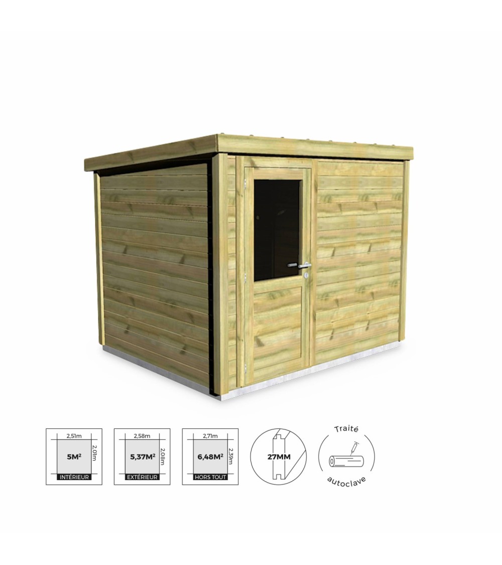 Les + produit :Fabriqué en France Traité autoclave classe 3 : qualité supérieure et longévité garantieStructure en bois sylvestre 27mmToiture en bac acier nervuréPour ranger les affaires de toute la famille, pensez à l'abri de jardin Aussois ! Avec sa capacité de stockage de 5m², il est pratique pour ranger : vélos, jeux d'enfants, outils de jardinage... Sa porte semi-vitrée permet de laisser entrer la lumière et vos affaires rangées y seront en sécurité grâce à la serrure livrée avec un jeu de 3 clés, permettant de fermer l'ensemble. Vous pouvez même décider de positionner la porte du côté droit ou du côté gauche, selon vos envies. Le style très naturel de ce petit chalet se fondera parfaitement dans votre jardin. Pour un rendu plus moderne, vous pouvez tout à fait peindre son bois dans la couleur que vous souhaitez. Informations complémentaires Le produit est livré en kit à monter soi-même. Une notice est fournie et le temps de montage à deux personnes est estimé à 10 heures. Il est possible que votre produit comporte des tâches vertes, ceci est dû au traitement par imprégnation en autoclave, les sels de traitement peuvent faire apparaître des petites tâches vertes à la surface du bois. Ce sont des remontées de résines qui ont été colorées par le produit de traitement. Ceci est absolument sans conséquence pour le bois. Ces petites taches peuvent sen aller simplement par un brossage ou un léger ponçage. Attention ! Ne pas monter sur le bac acier A noter quil est important de vous renseigner préalablement auprès de votre mairie pour connaitre les autorisations durbanisme liées à laménagement dun abri. De manière générale, un abri ayant une superficie inférieure ou égale à 5m² ne requiert aucune formalité administrative. Pour une structure entre 5 et 20m² vous devrez remplir une déclaration préalable de travaux. Au-delà de 20m² un permis de construire sera nécessaire.https://www.service-public.fr/particuliers/vosdroits/F662Caractéristiques