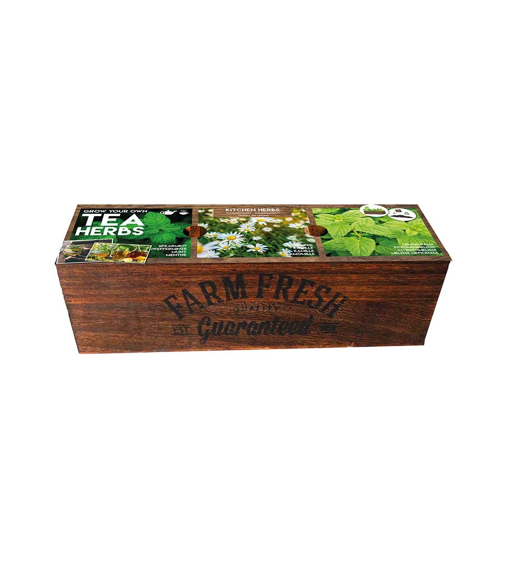 Joli coffret en bois, herbes à thé à faire pousser soi-même. Coffret contenant 3 compartiments pour cultiver très facilement vos herbes à thé : Menthe, camomille et mélisse officinale Tout est prévu dans ce kit prêt à l'emploi : terreau, graines, conseils de plantation... Dimensions du coffret : 29.8 x 9.5 x 9 cm