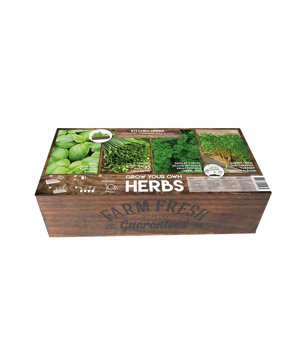 Herbes de cuisine dans un joli coffret en bois. Ce coffret en bois contient tout ce qu'il faut pour cultiver très facilement des herbes de cuisine : Basilic, ciboulette, persil frisé et cresson. Cultivez vos herbes de cuisine vous mêmes : Tout est prévu dans ce kit prêt à l'emploi : le coffret en bois, le terreau spécial, les graines, les étiquettes témoins, et des conseils de culture. Dimensions : 39.5cm x 7.5 cm x 19.5 cm