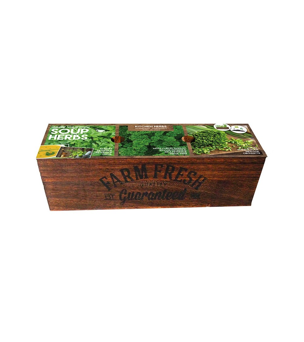 Joli coffret en bois comprenant des herbes à soupes Coffret contenant 3 compartiments pour cultiver très facilement vos herbes à soupe : Adapté aussi bien pour l'intérieur que pour l'extérieur ! Cultivez vos aromates à soupe vous mêmes : Persil, persil frisé et ciboulette Tout est prévu dans ce kit prêt à l'emploi : terreau, graines, conseils de plantation... Dimensions du coffret : 29.8 x 9.5 x 9 cm