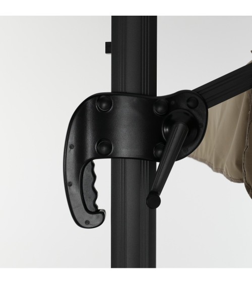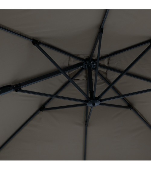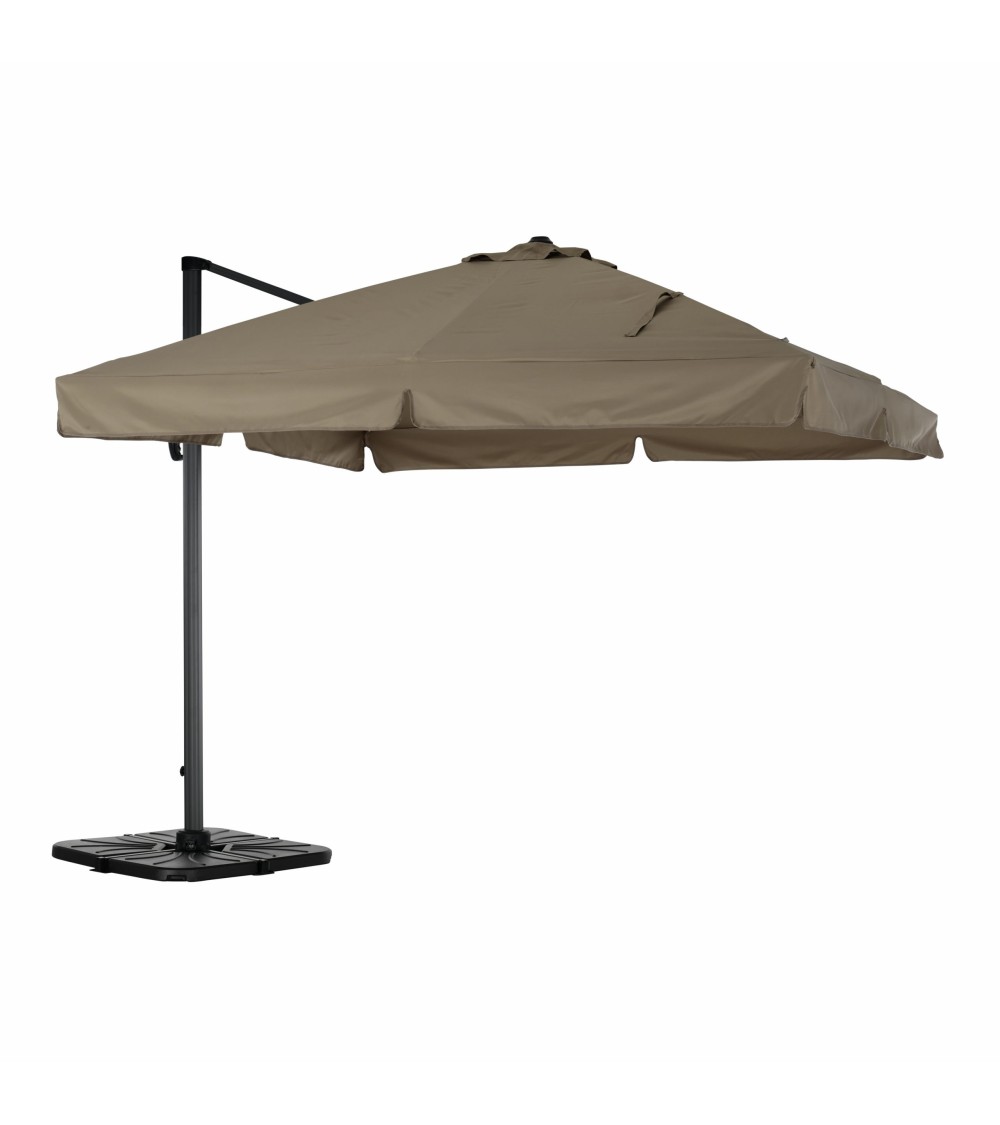 Le parasol suspendu Milan ( H 240 x L 300 x PR 300 ) avec jupe extérieure pour le jardin ou la terrasse possède un mât latéral très robuste en aluminium de couleur gris anthracite. Le tissu a une belle finition marron taupe, qui est hydrofuge, anti-taches et comprend également une cheminée de ventilation. Il peut être tourné à 360 degrés et est inclinable en hauteur, ce qui vous permet de choisir l'orientation la plus pratique. Il dispose d'une manivelle qui vous permet d'ouvrir et de fermer le parasol très simplement. Ce parasol possède une structure robuste avec un total de 8 tiges et un design élégant qui le rend idéal pour un aménagement de jardin ou de terrasse que vous pourrez garder toute l'année.Les dalles de lestage ne sont pas incluses avec le parasol.