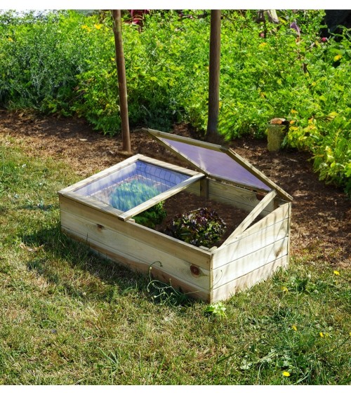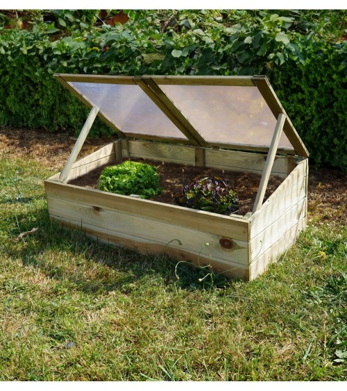 Cette serre en bois contient un grand compartiment et avec ses deux ouvertures, vos végétaux fragiles seront protégés.Sur le principe d'un châssis, c'est la solution idéale pour la levée des semis et des plantations en toute saison. Sa petite taille convient aux jardiniers débutants ou à ceux possédant une petite surface de jardin mais désireux tout de même de faire pousser leurs propres légumes ou prendre soins de leurs plantes.Son bois est traité autoclave classe 3, afin de vous garantir une très haute résistance à l'humidité et aux alternances répétitives d'humidité et de sécheresse. Il est labellisé FSC garantissant une gestion durable de la forêt d'où provient ce bois.Livré sans fond.Matière : pinVitre : plexiglas