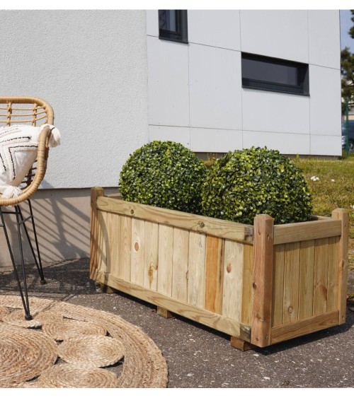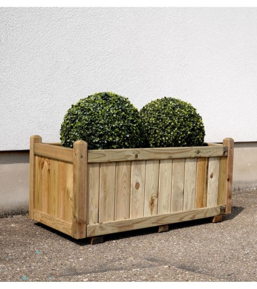 Le bac à fleurs en bois 113 L Vendôme 100 Jardipolys possède un design simple et classique pour s'intégrer très facilement dans votre jardin.Grâce à sa grande capacité, il accueillera avec élégance vos plantes, fleurs et petits arbustes.Il est conçu en pin européen dont les lames sont fixées par clouage invisible et dont les montant sont fixés par vis.Ces deux types de fixation assurent un bac robuste. Pour plus de stabilité, cette jardinière est dotée de deux pieds.Son bois est traité autoclave classe 3, afin de vous garantir une très haute résistance à l'humidité et aux alternances répétitives d'humidité et de sécheresse./Il est labellisé FSC garantissant une gestion durable de la forêt d'où provient ce bois.