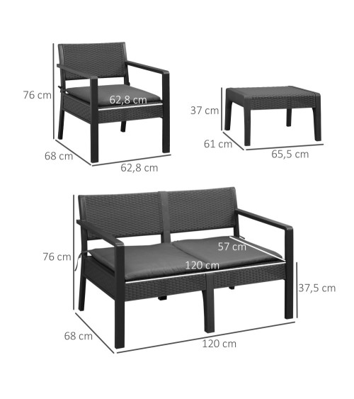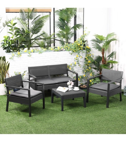 Ce splendide ensemble salon de jardin 4 places 4 pièces composé de 2 fauteuils, d'un canapé 2 places et d'une table basse vous permettra de profiter au mieux des beaux-jours. Son design style yachting mélant métal et résine tressée sublimera votre extérieur.Caractéristiques :- Salon de jardin design contemporain style yachting mélant sobriété et modernité avec élégance pour sublimer votre extérieur- Jolie mixité des matériaux : métal époxy et résine tressée 2 fils donnant plus de cachet et caractère à votre ensemble- Ensemble salon de jardin 4 places 4 pièces composé de 2 fauteuils, d'un canapé 2 places et d'une table basse- Armature haut de gamme en métal époxy anticorrosion robuste anthracite, dossiers, assises, plateau de table en résine tressée imitation rotin PE : usage pérenne- Coussins d'assise déhoussables avec zip coloris gris : entretien pratique, facile- Grand confort : coussins avec garnissage mousse haute densité (épaisseur 5 cm) et revêtement polyester doux, assise profonde, dossier ergonomique, accoudoirs, patins antidérapants- Montage facile, rapide à l'aide du manuel d'assemblage illustré fourniSpécifications :- Couleurs principales : anthracite, gris- Matériaux principaux : métal époxy, résine PE, garnissage mousse, polyester- Dim. canapé 2 places : 120L x 68P x 76H cm- Dim. fauteuils : 62,8L x 68P x 76H cm- Dim. table basse : 65,5L x 61l x 37H cm- Dim. assises (sans coussin) : 120L x 57P cm (canapé), 62,8L x 57P cm (fauteuils)- Hauteur d'assise (sans coussin) : 37,5 cm- Charge max. recommandée : 240 Kg (canapé), 120 Kg (fauteuils), 30 Kg (table basse)- Livraison effectuée en 2 colis- Réf. : 84B-722
