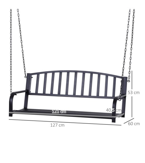 Ce superbe banc suspendu en métal époxy noir vous permettra de profiter pleinement du soleil dans votre jardin, sur votre terrasse, au bord de votre piscine, etc... ! Cette grande balancelle à l'esprit romantique, sublimera votre extérieur.Caractéristiques : - Banc suspendu en métal époxy noir à l'esprit romantique, sublimera votre extérieur- Dimensions idéales pour 2 personnes, assise profonde, dossier haut, accoudoirs pour plus de confort- Convient à tous types d'extérieur (jardin, piscine, terrasse, porche, patio) aussi bien suspendu à un arbre, au plafond, à une structure de balancelle, etc...- Structure robuste en métal époxy anticorrosion + chaînes en métal incluses pour une sécurité optimale et un usage pérenne- La longueur de la chaîne est réglable pour vous permettre de régler la hauteur de l'assise- Montage facile à l'aide de la notice illustrée fournieSpécifications : - Couleur : noir- Matériau principal : métal époxy anticorrosion- Dim. totales : 127L x 60l x 53H cm- Dim. assise : 121L x 40,5l cm- Largeur dossier : 119 cm- Longeur chaînes : 350 cm- Charge max. recommandée : 220 Kg- Certification norme EN581-1-2- Livraison effectuée en un colis- Réf. : 84A-035
